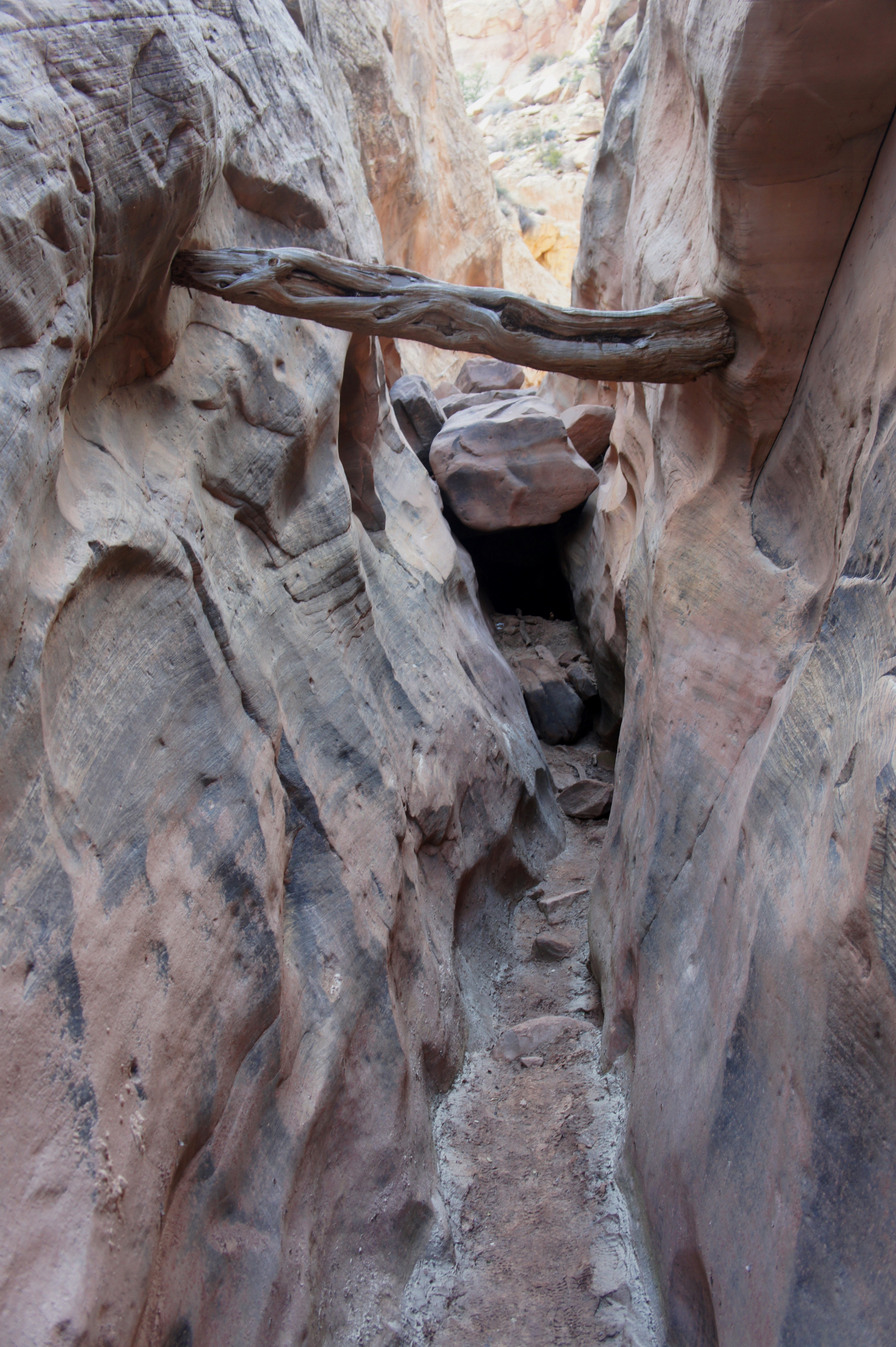 (Note: Conditions in slot canyons can change frequently and dramatically, especially after flash floods. The following describes the status of chockstones, water levels, and other obstacles as they were on March 23, 2015. Be sure to check with the Capitol Reef Visitor Center for the latest.)