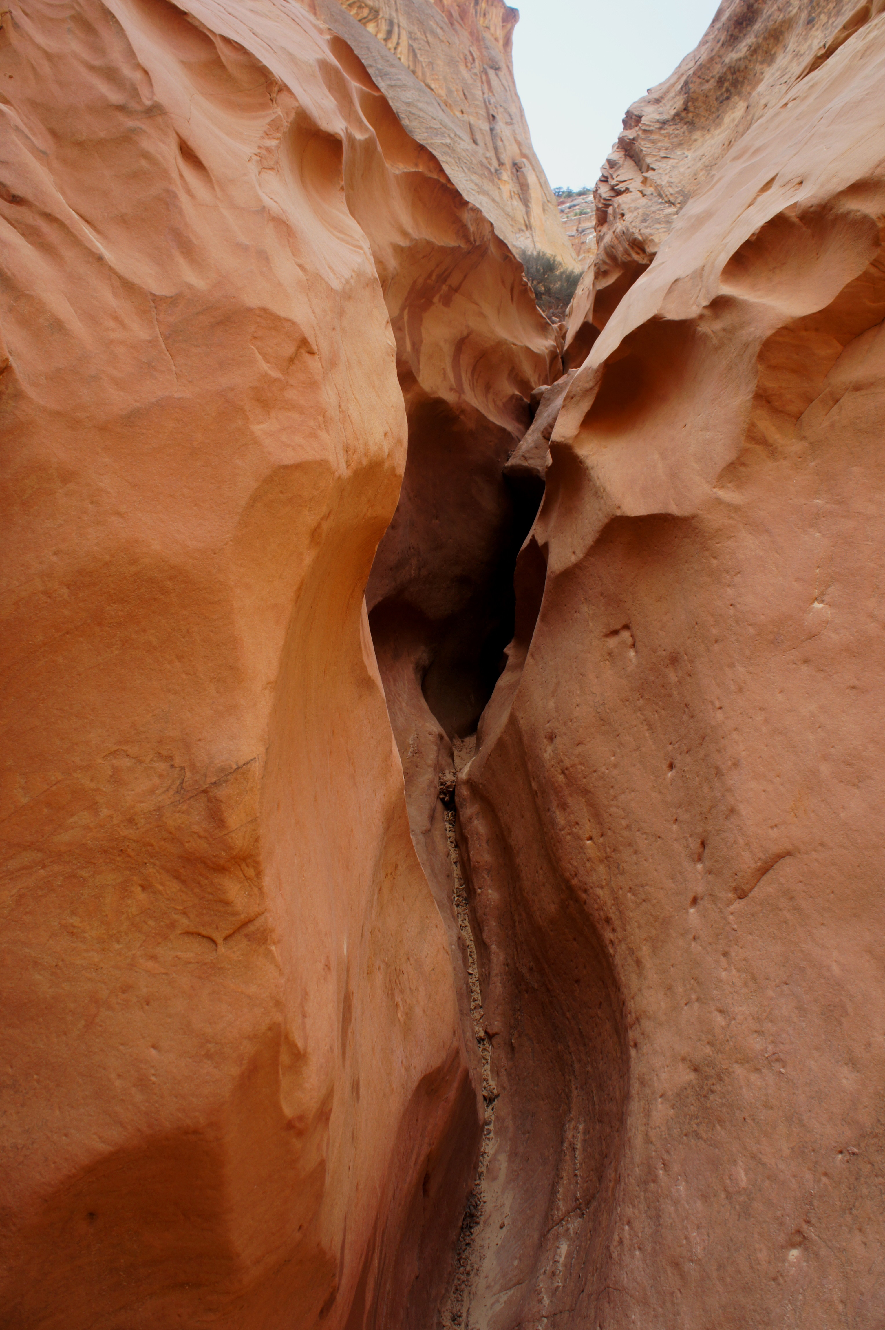 The hike to this point has cut through the relatively uninteresting Entrada sandstone and Carmel formation, but it will soon enter the slot-forming Navajo sandstone. 5-10 minutes beyond the pouroff, the wash meanders through twisting narrows—not the best in Capitol Reef, but pleasant and photogenic nonetheless. A handful of boulder chokes in the narrows necessitate minor scrambling. After two short bends, the canyon opens up slightly and splits. Take a hard right at the fork, turning toward a stretch of appealing narrows to the northwest.