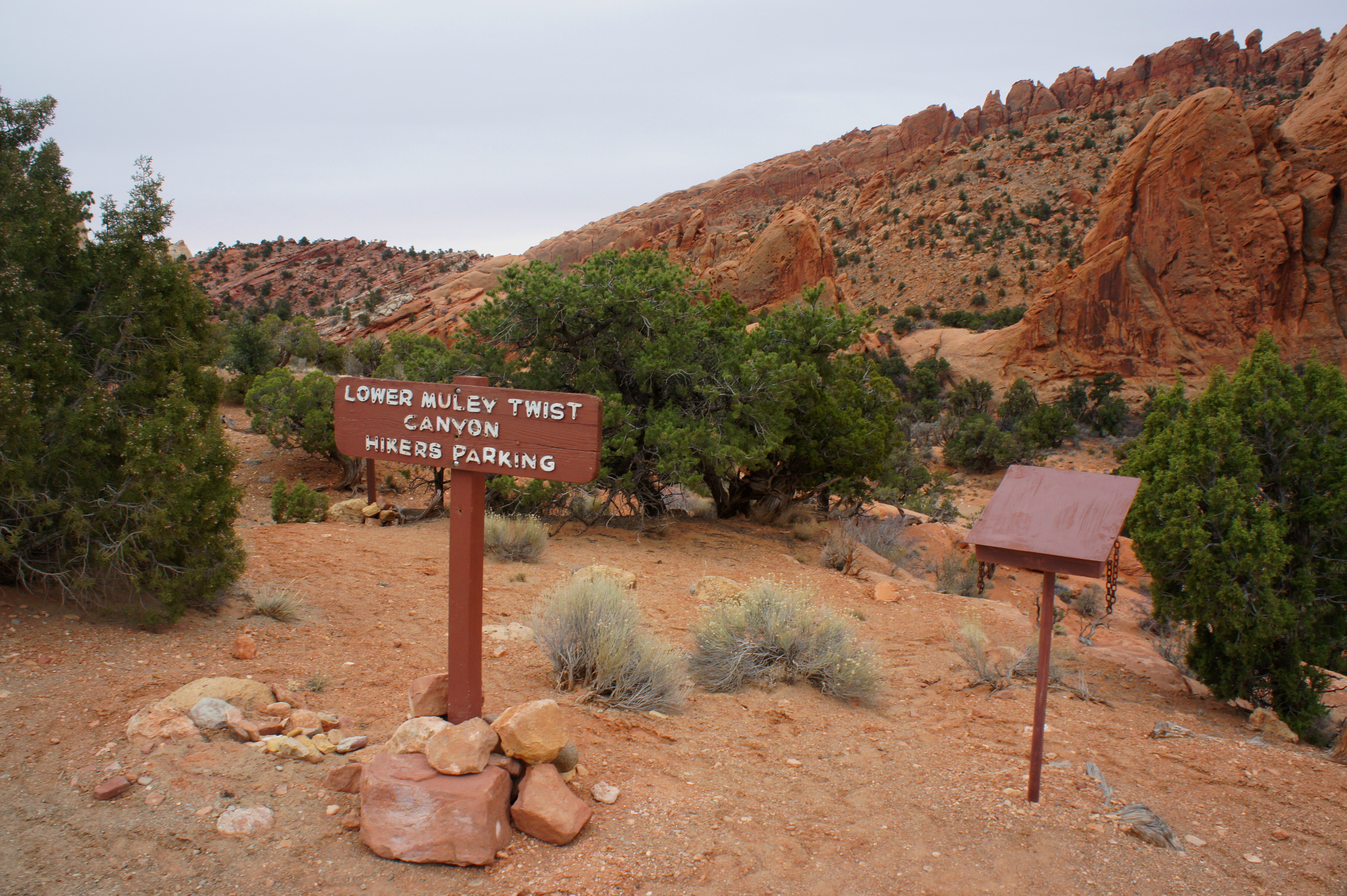 The upper section of Lower Muley Twist Canyon (not to be confused with Upper Muley Twist Canyon, a nearby but entirely different hike) is best accessed from the Burr Trail Road, approximately two miles west of the junction with the Notom-Bullfrog Road, just atop the Burr Trail switchbacks. Assuming good driving conditions, it takes roughly 1.5 hours from the Capitol Reef Visitor Center to reach this point. A burgundy sign reading “Lower Muley Twist Canyon Hikers Parking” marks the trailhead. It can be a tight squeeze, as the parking area accommodates no more than 4-5 vehicles at once. There is also a trail register at the site.