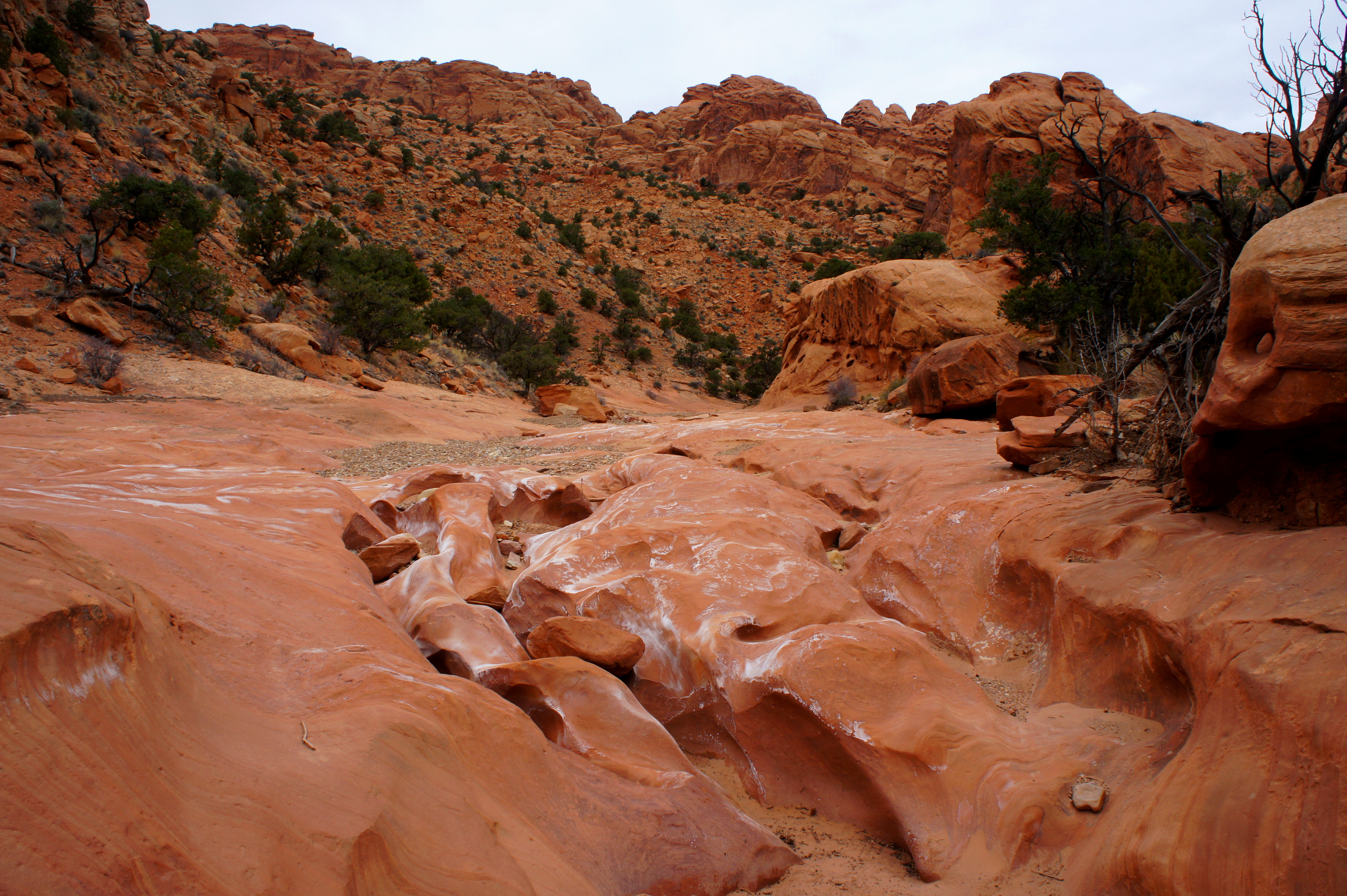 It is impossible to miss the high, red-orange walls bounding Lower Muley Twist on either side. These are composed primarily of Wingate sandstone, a sedimentary rock layer responsible for more cliff-forming landscapes in Utah than any other. Stripped of its durable caprock in the Kayenta formation, the Wingate has in many places eroded into bulky knobs and surging spires. The Wingate also forms the chiseled bedrock throughout much of this section and is responsible for framing the hike’s three sets of narrows.
