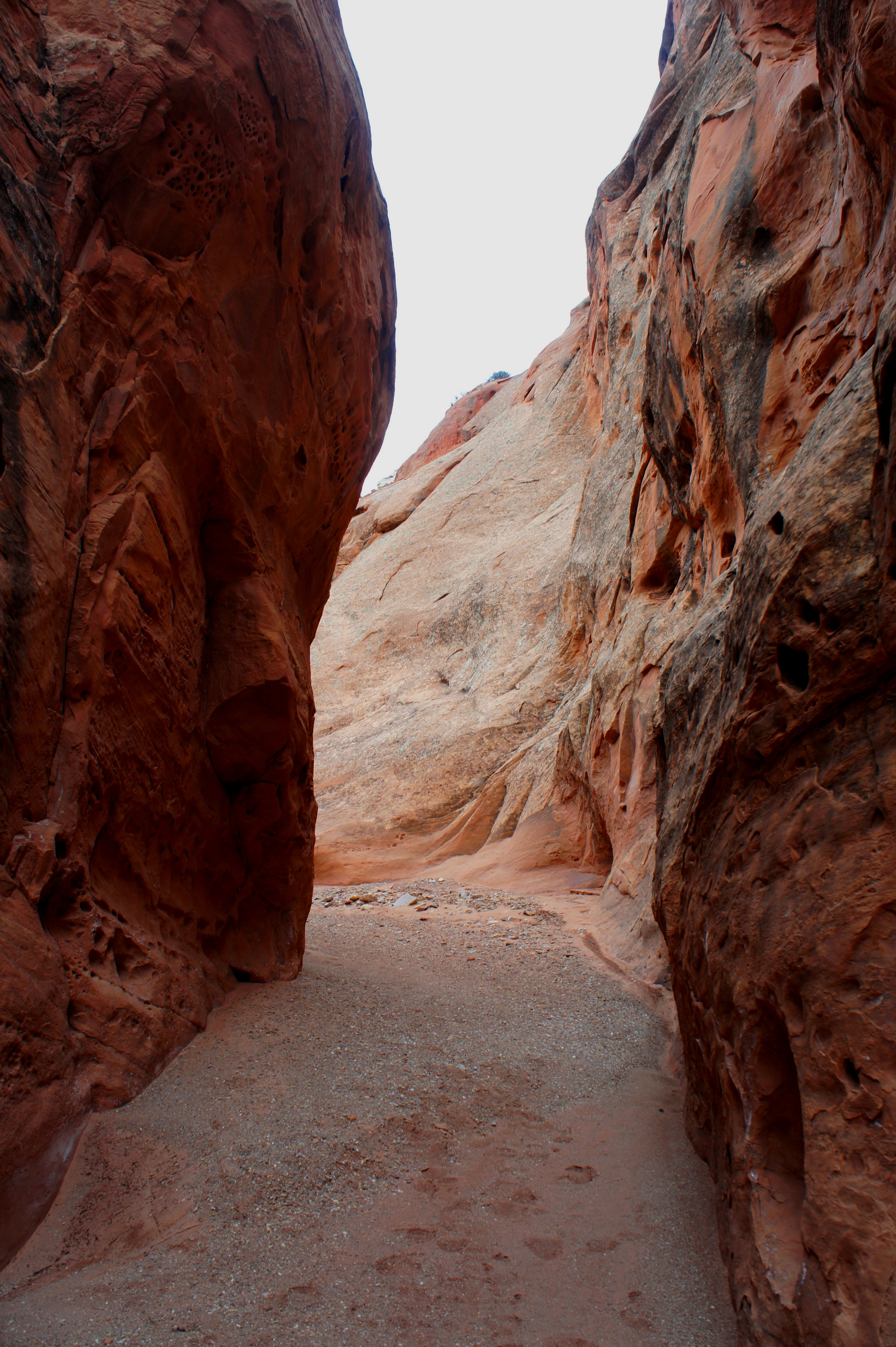 Upon exiting, the wash broadens again at the base of a tall, three-headed spire that is passed on the left. It is a roughly 10-minute walk from the second narrows to the third—the longest, deepest, and arguably most impressive of the bunch. Here the canyon thins to as little as 10 feet wide, while the walls are laced with honeycomb weathering, or tafoni.