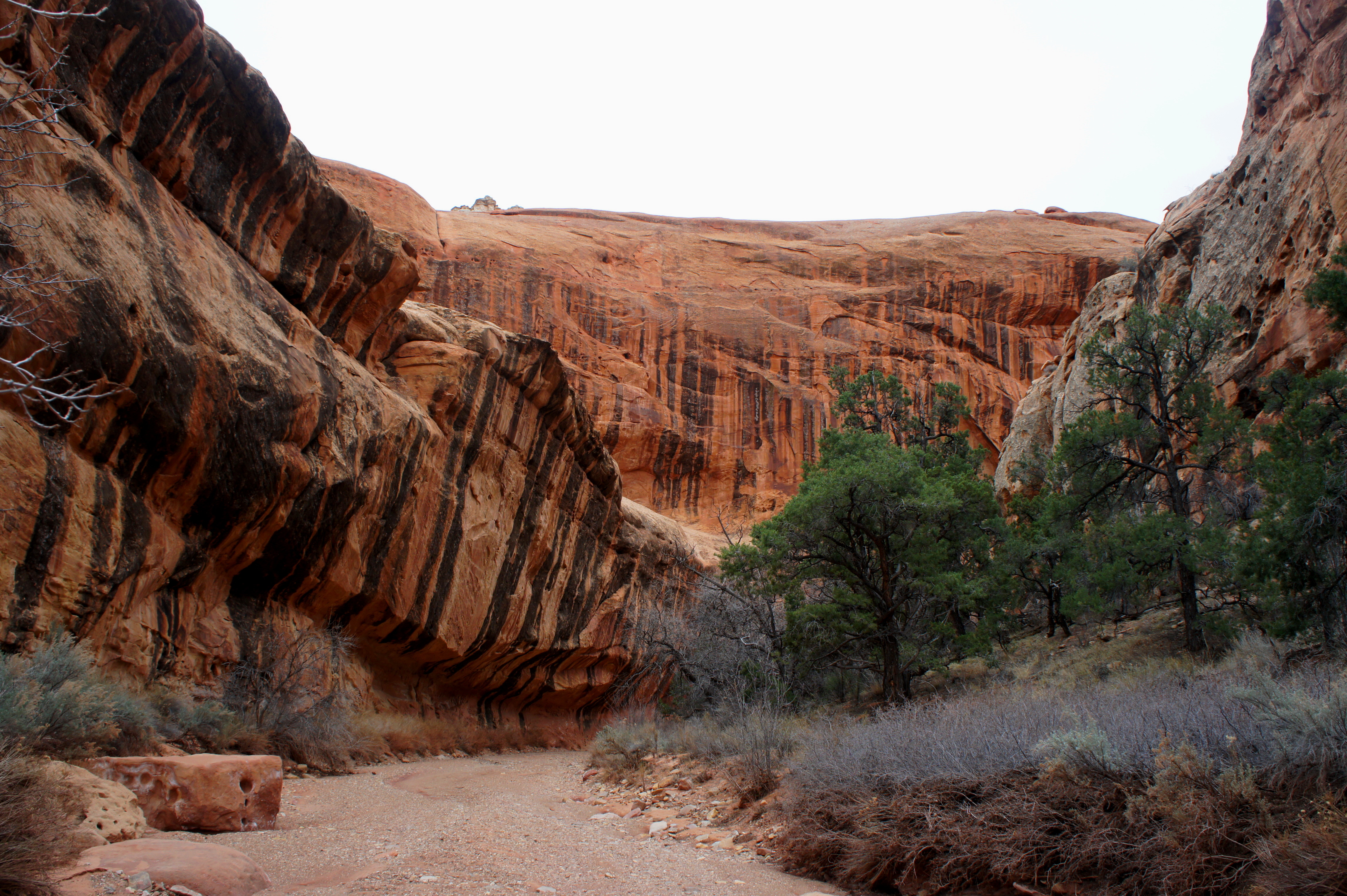 The landscape beyond is accented by frequent examples of black desert varnish, manganese-coated streaks adhered to rock faces by tiny microbacteria over the course of thousands of years. One varnished overhang encountered within five minutes past the open area is particularly impressive. After another bend, a second alcove adds flavor to the eastern wall. This leg of Lower Muley also supports tall juniper trees and Gambel oaks.