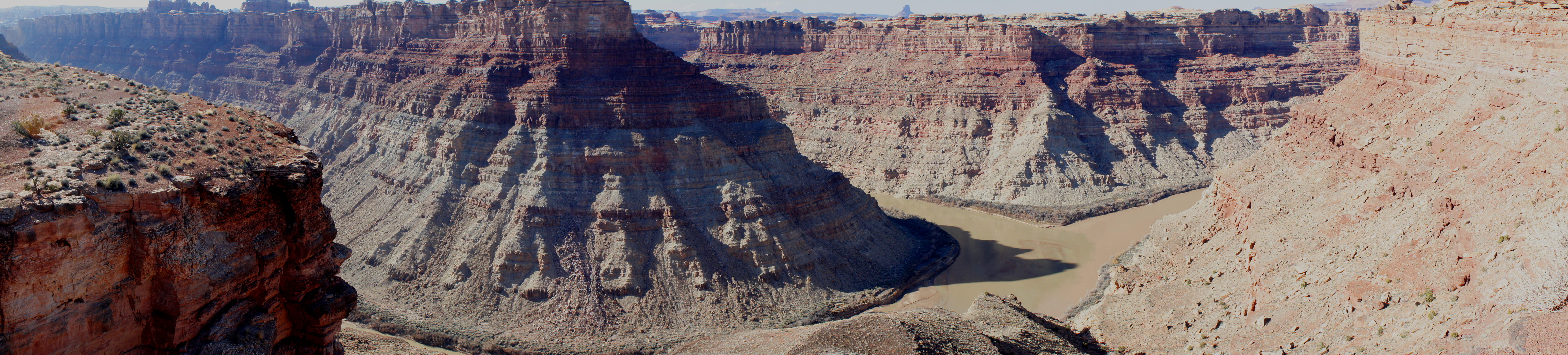 Across the Colorado to the south and west is the Maze District, where the spiny fins of The Doll House are visible off in the distance. The terrain opposite the confluence is part of the Island in the Sky District, as are the tall Wingate sandstone buttes on the northern horizon. The yellow-tinted cliffs on the near side to the right belong to the Needles District, capped by the ubiquitous Cedar Mesa sandstone.