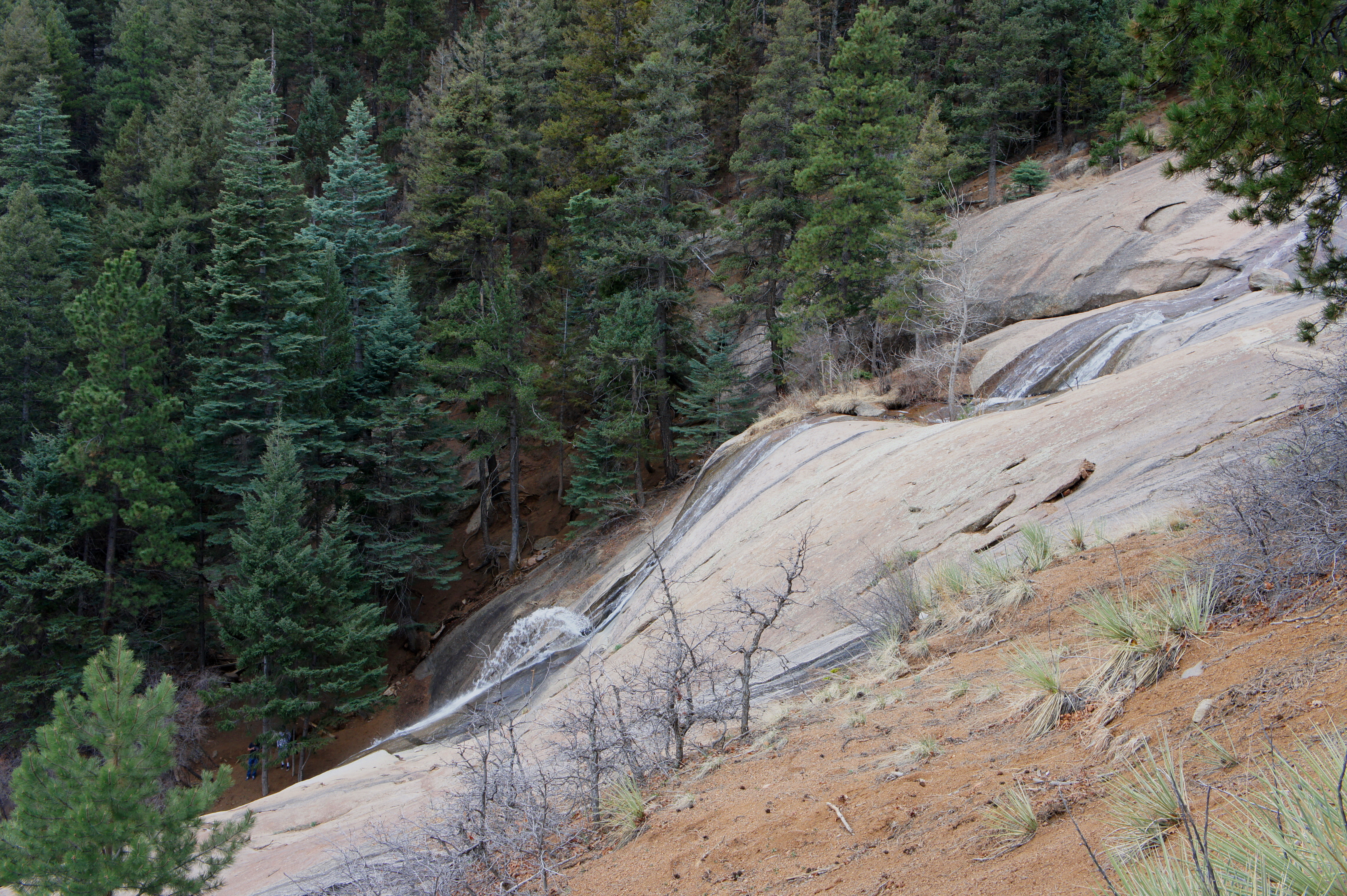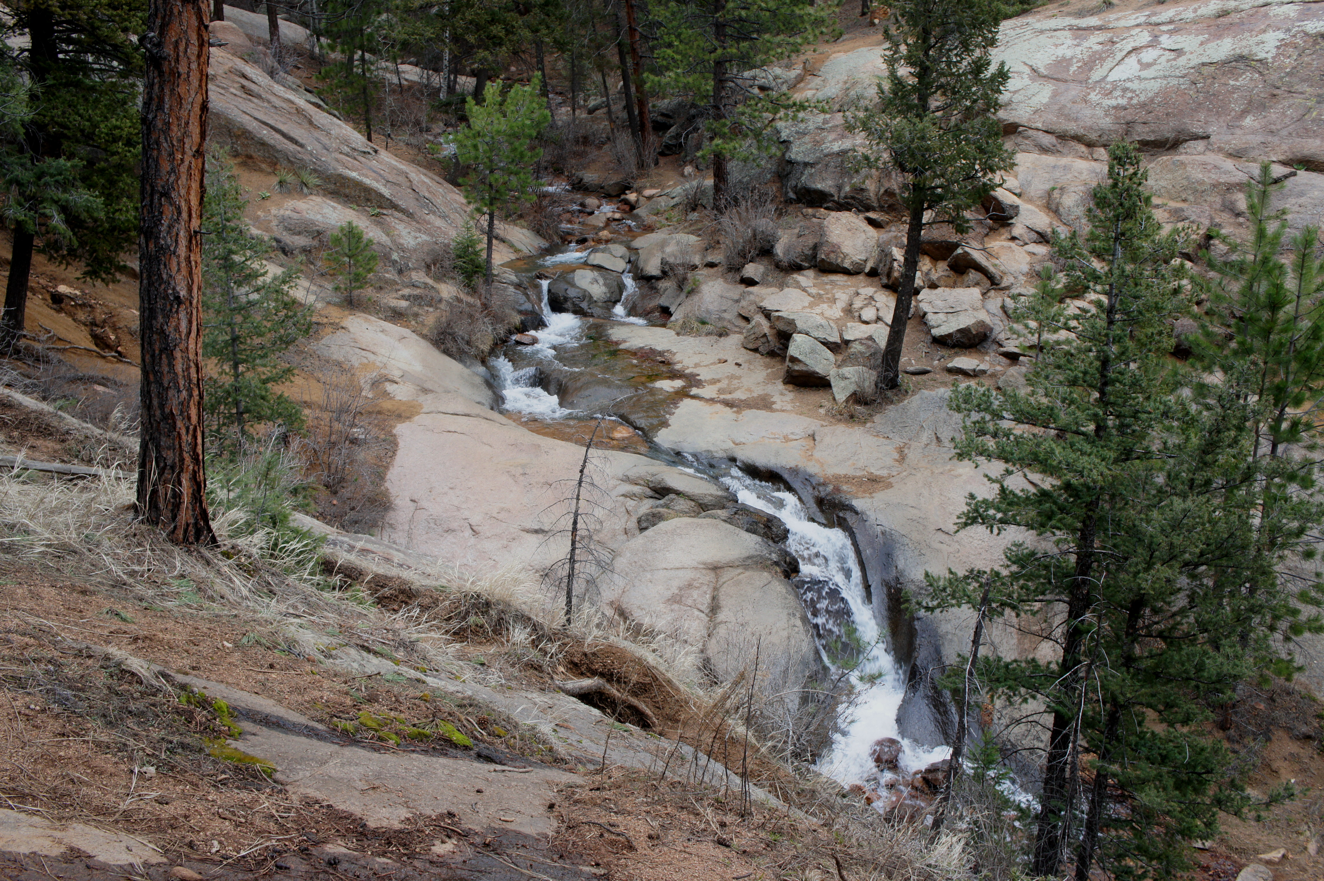 Peering down Buffalo Canyon to North Cheyenne, the city of Colorado Springs can be seen through the V-shaped valley. Silver Cascade Falls is actually best viewed well before the end of the trail, at a bench halfway up the final, southwest-bearing climb. From here, water can be seen rocketing off a series of granite ledges, at times propelled into the air by minor rock jams.