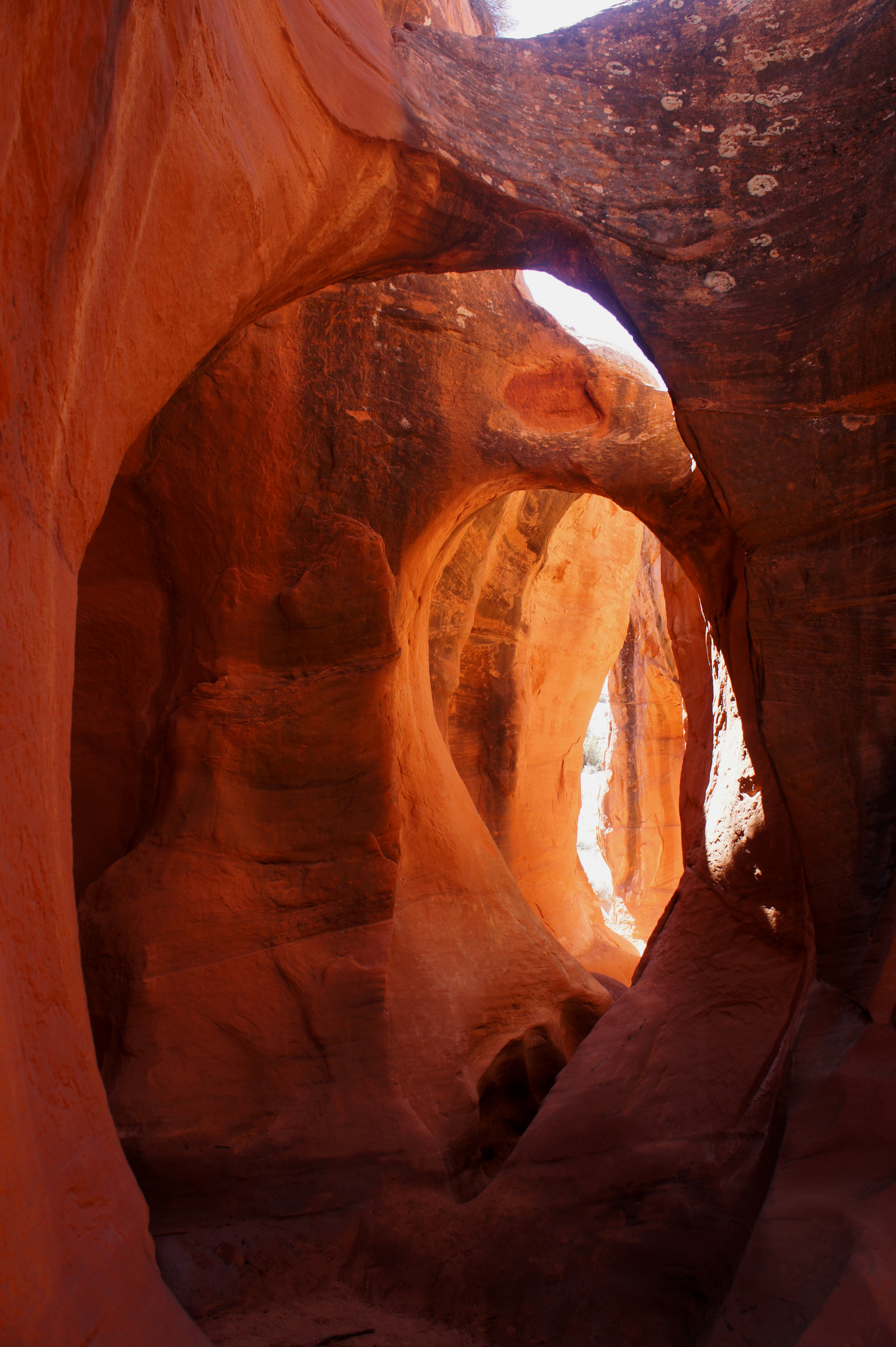 As Peekaboo angles northeast, the going gets easier, and the slot gradually opens up. The threadlike, slickrock tread—at a couple points no broader than the width of a hiking boot—gives way to a sandy, flat bottom.