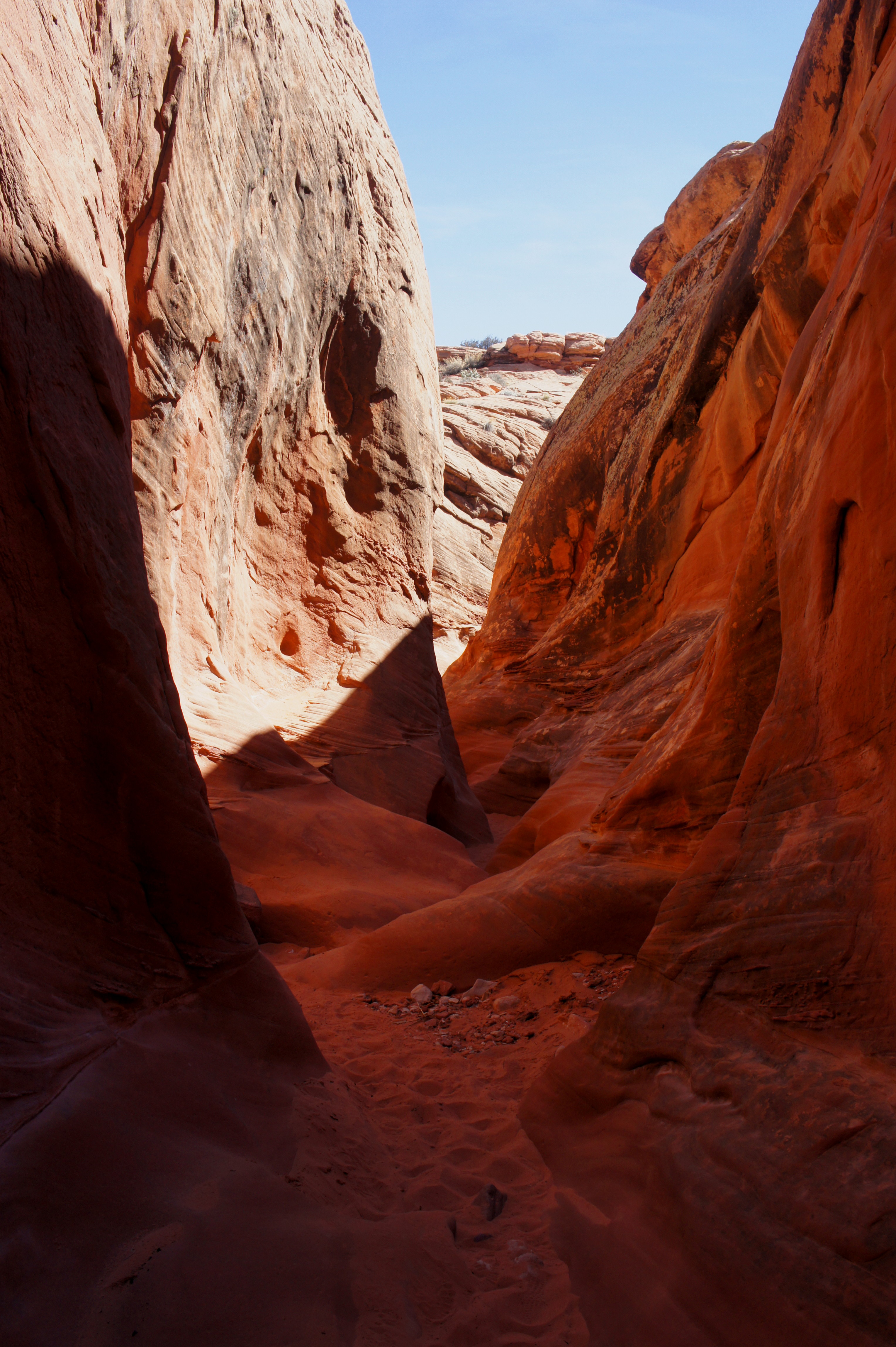 Roughly midway through Spooky, a spiraling, 5-foot pouroff is perhaps best descended with a controlled jump. The slot continues for another 1/10 mile, gradually opening up to splendid narrows. Around 1/3 mile from the start, the narrows abruptly end—finally revealing the full sun again at long last.