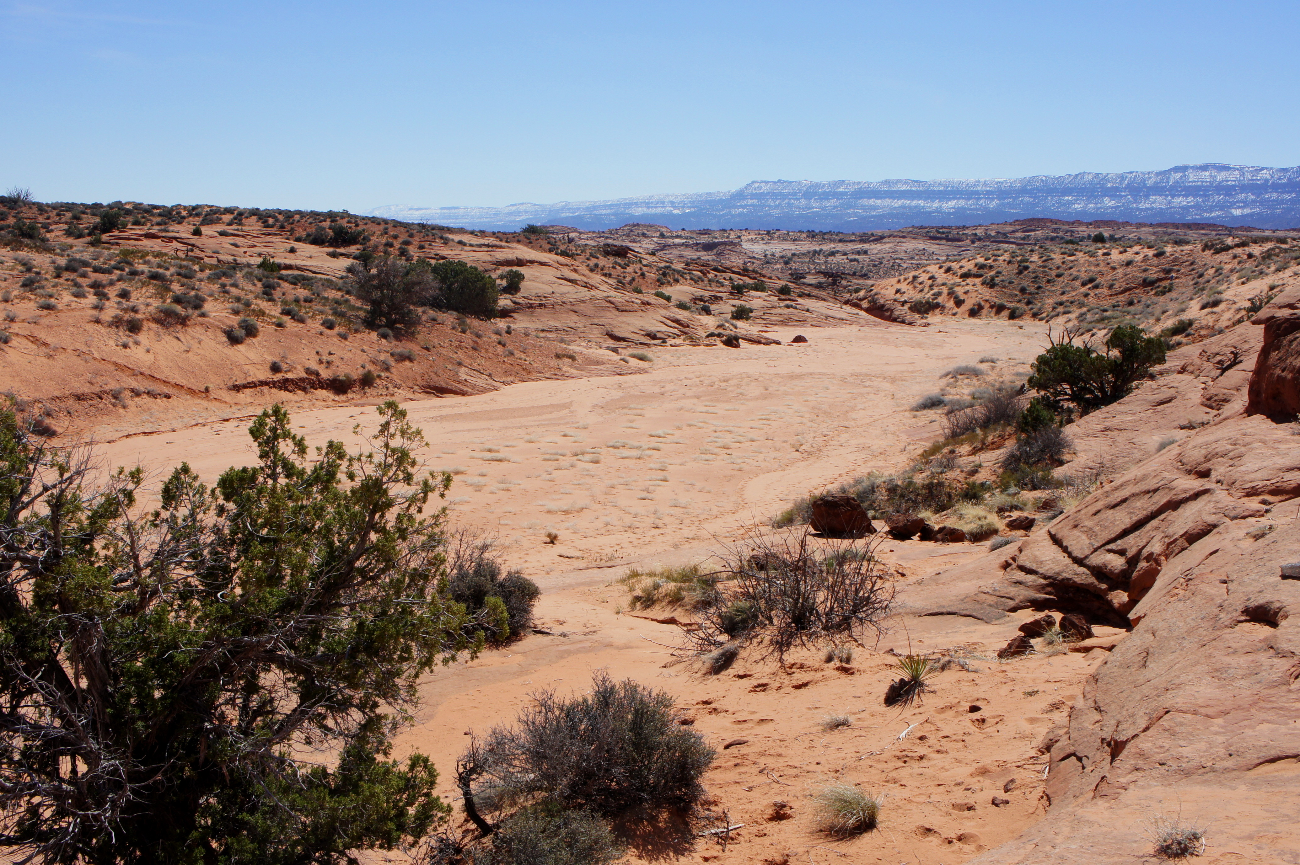 The first half of the approach requires switchbacking down a series of slickrock benches, following rock cairns. At first cutting east, the route doubles back to the west, edging down to a minor draw where a dusty footpath can be found. Follow this trail, rather easy to discern, down to the sandy gulch, bounded on the right side by a sheer wall of Navajo sandstone. Within minutes, this ravine merges with the main drainage—the Dry Fork of Coyote Gulch.