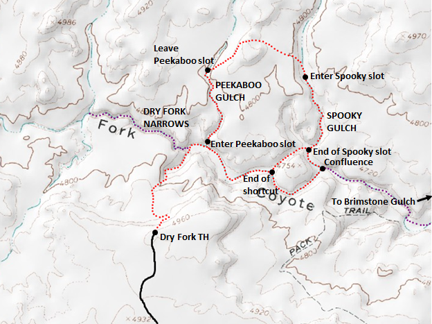 The alternative, shortcut route is to catch a hiker-made trail, shortly after exiting the Spooky slot, bearing southwest through a minor ravine. The route ascends gradually to a low pass, then descends a brushy gulch leading back to the Dry Fork. From here, it is only about 1/3 mile back to Peekaboo and the turnoff to the Dry Fork Trailhead.