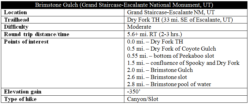 Brimstone Gulch trail information Escalante distance slot