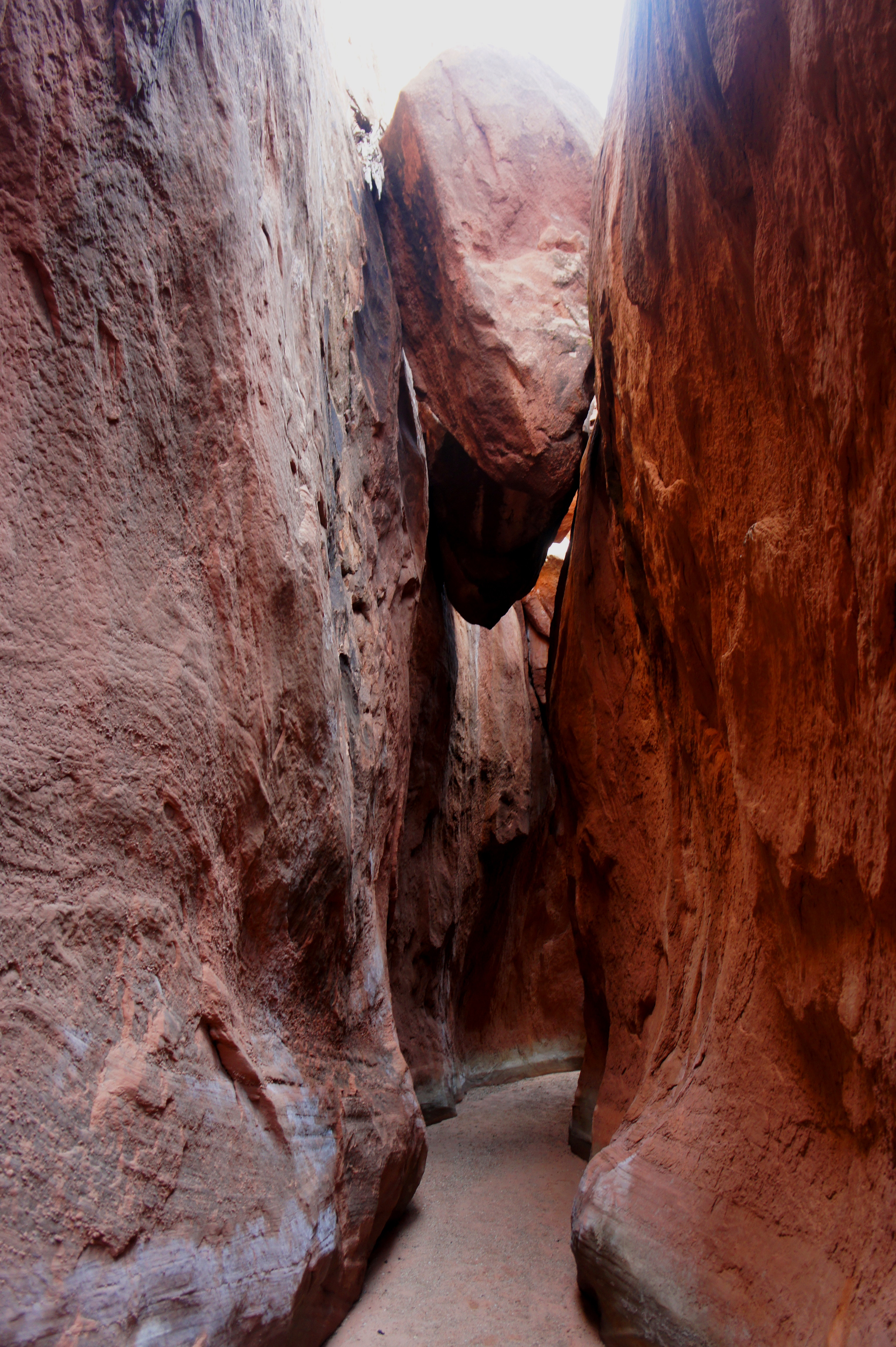 The first is short and includes no obstacles. The second, a few minutes farther, thins to around 4-5 feet wide and contains a large boulder that is relatively easily bypassed on the right or left. Then, a peculiar sight: four arrow-shaped chockstones, all within 50 yards of one another, caught in the upper reaches of the narrows. Hikers will pass under them each in turn.