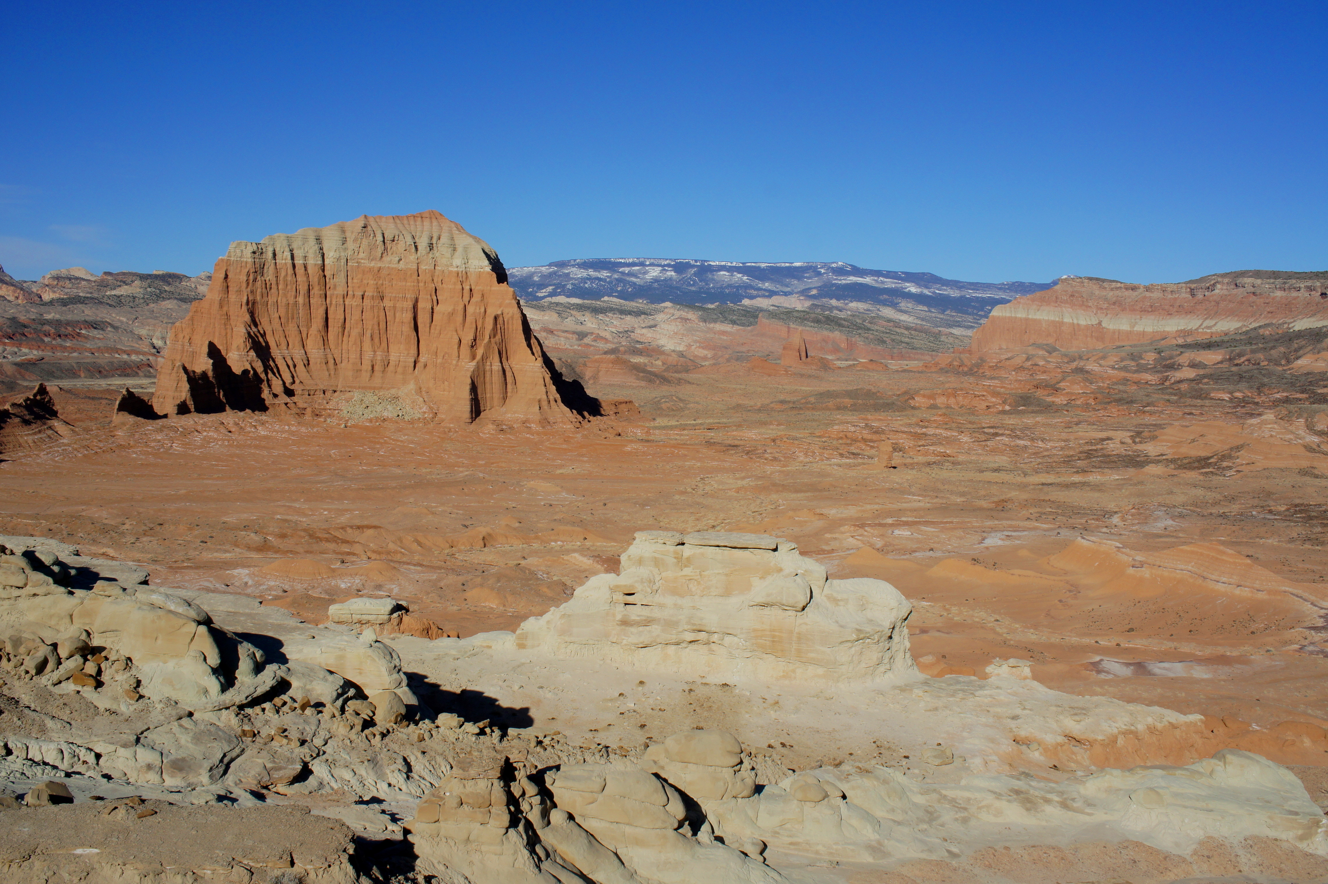 Below the Curtis is the Entrada sandstone, a red-orange layer that, in this part of Utah, is very brittle and prone to erosion. Jailhouse Rock is primarily composed of Entrada, as is Temple Rock, a much smaller monolith spotted beyond Jailhouse to the right. Finally, behind and to the left of Jailhouse Rock, the Waterpocket Fold—dominated by Navajo sandstone—curves northwest, revealing a labyrinth of canyons and sweeping slickrock domes.
