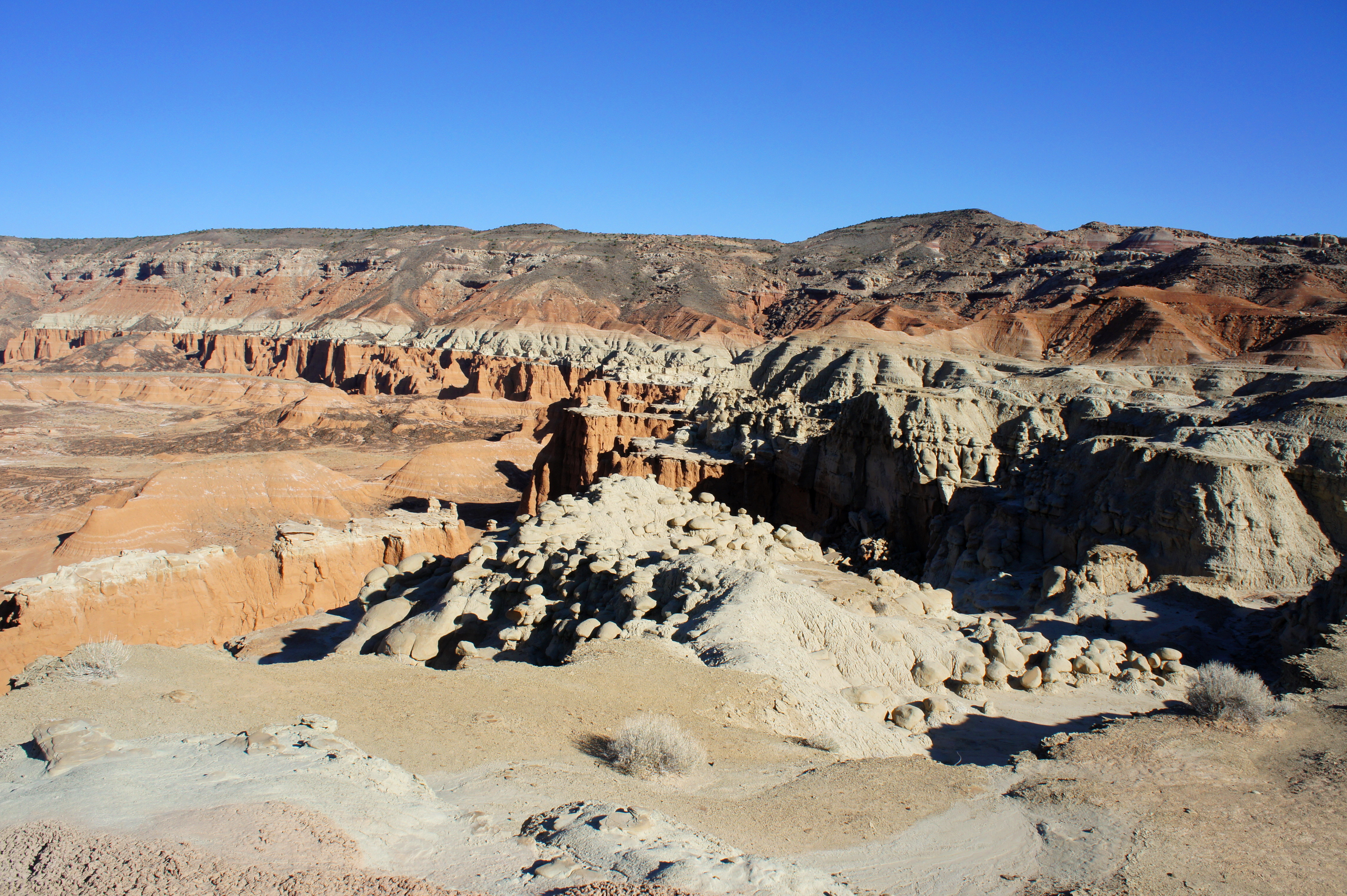 It is possible to continue on from the viewpoint to the base of Jailhouse Rock, to Temple Rock, and to Deep Creek. This involves a steep descent, however, following the old road as it snakes down to the Lower South Desert. Keep this in mind as a possible backpacking excursion.