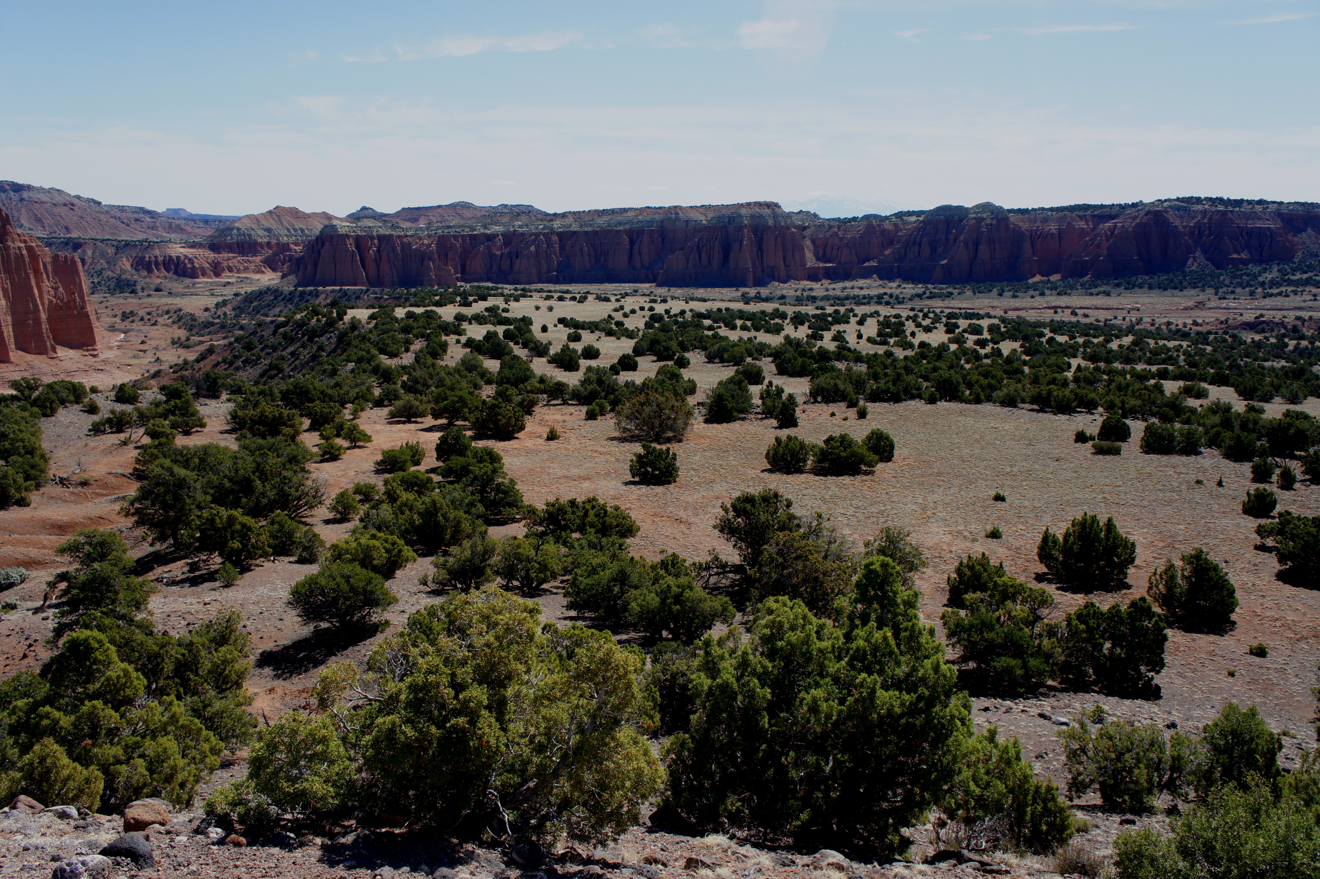 Peeking through the troughs between the Cathedrals, bits of the multicolor Jones Bench emerge into view. Turning your back on the Cathedrals, the colorful escarpment of The Hartnet unfolds to the south, tarnished only slightly by the sight of the switchbacking road. Those with a keen eye may be able to spot Morrell Cabin, a modest cowboy outpost dating to the 1930s, situated roughly midway between here and the switchbacks. To the west, the forested slopes of Thousand Lake Mountain and the Fishlake Mountains, which often harbor snow until June, complete the frame.