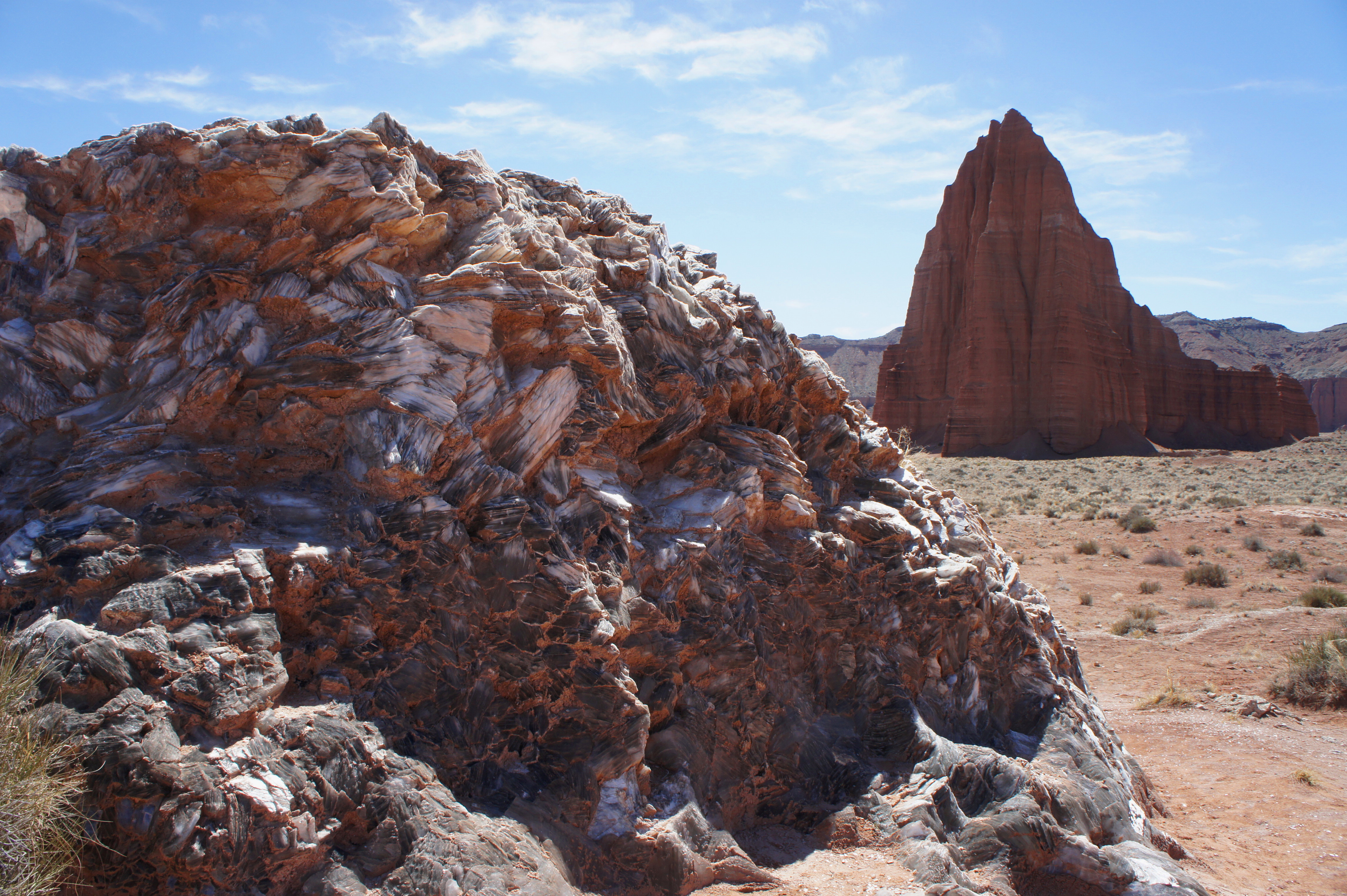 Rounding a corner to the northeast, the Cathedral Road traverses the barren Middle Desert, bounded on both sides by flamboyant cliffs. The Cathedral Valley Junction—where the Baker Ranch Road takes off to the north—sits at the doorstep of a coal-colored volcanic dike. More of these basalt plugs will be visible as visitors venture farther east.