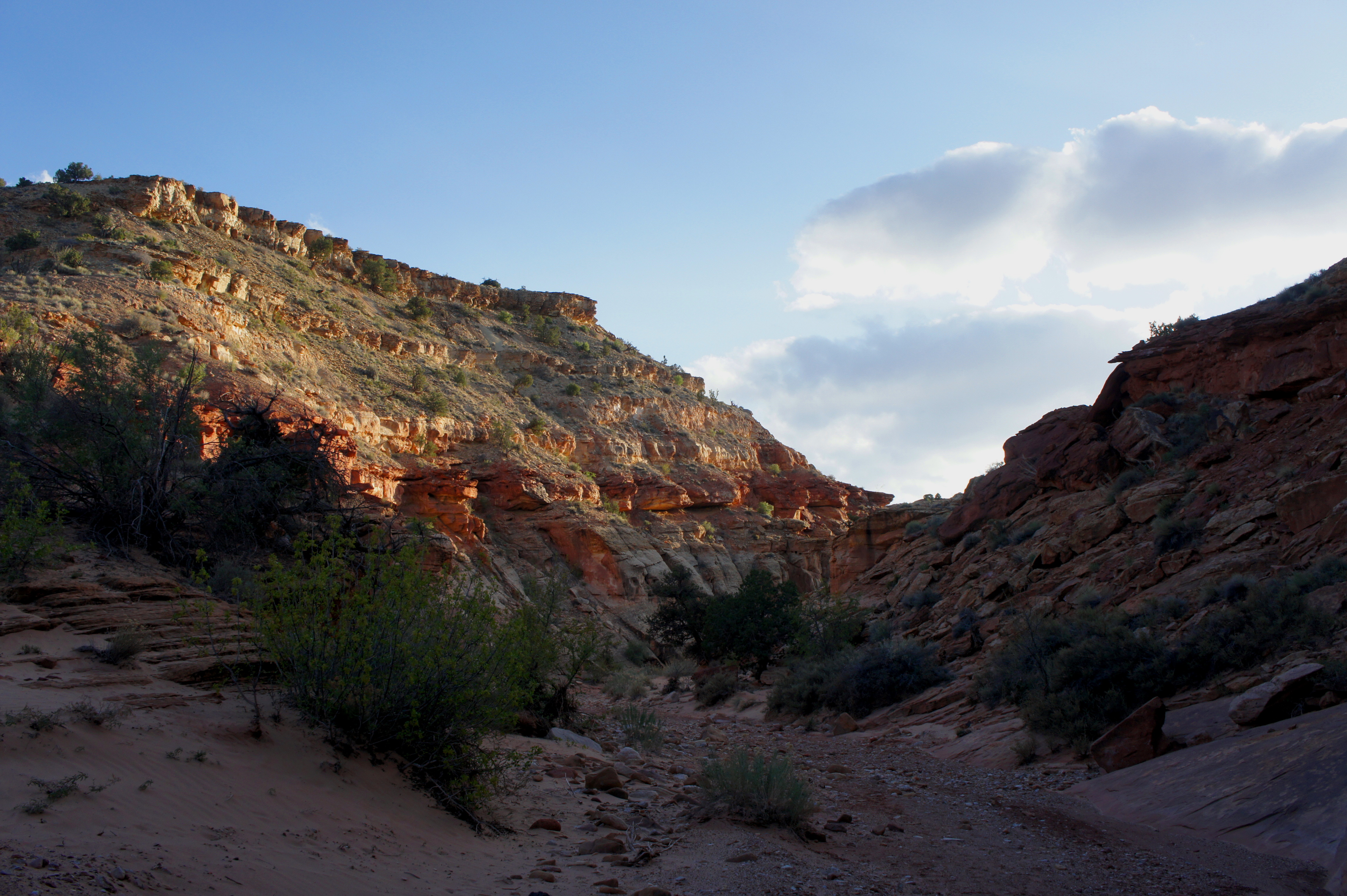 It is roughly a 10-minute walk from the Tanks junction to a concrete dam, which comes as somewhat of a surprise. 5-10 minutes later, the wash passes under a deep red wall on the left, rounds a bend into a sunny expanse, and encounters a second minor dam. (Note: Both dams are easily bypassed on the left.) The walls ahead are firmly situated within the Page, Carmel, and the beige-colored Salt Wash member of the Morrison formation.