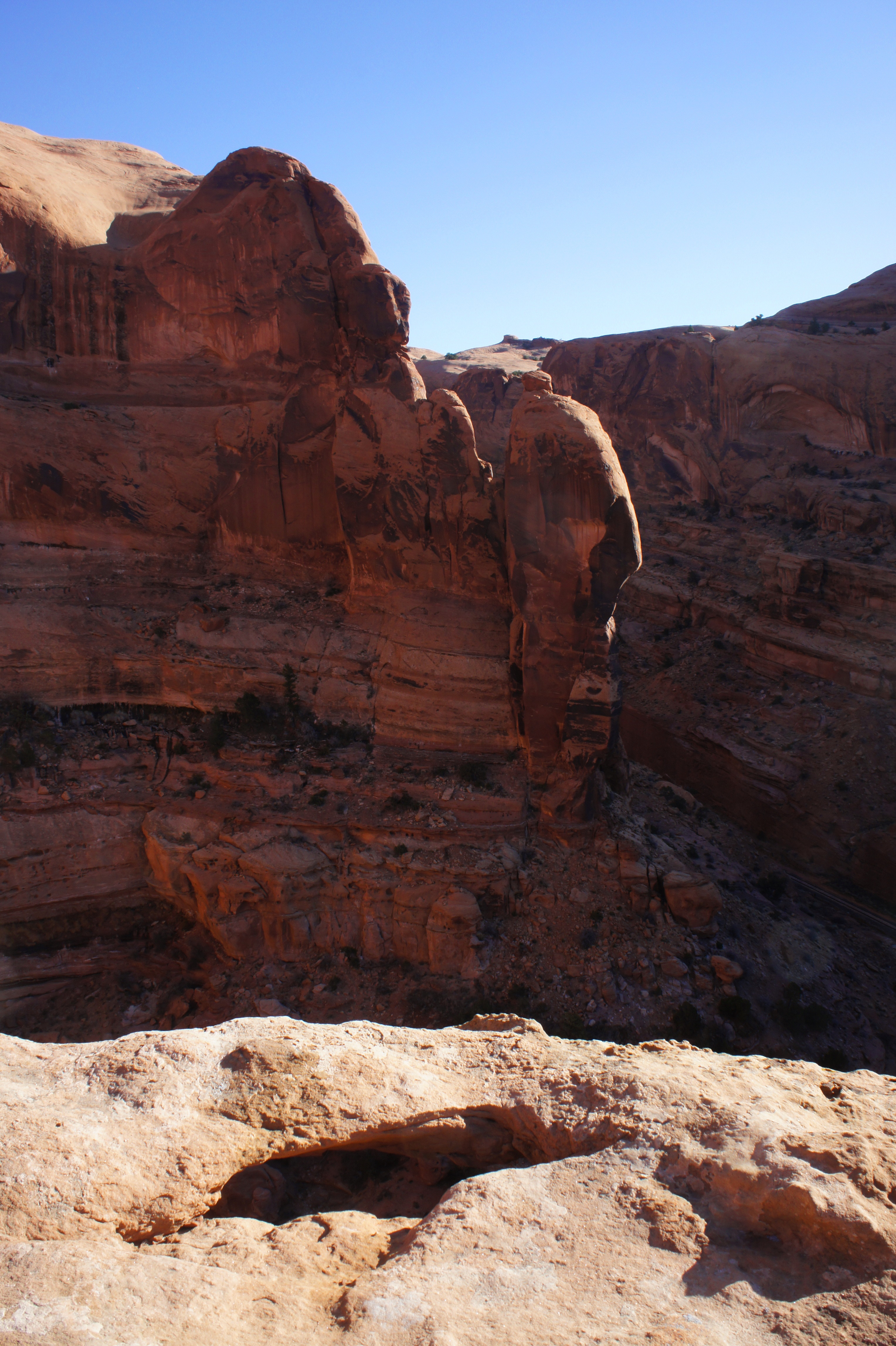 It’s naturally a popular spot for photographers—note that morning hikers will have to cross under the arch to the east side to avoid dense shadows. To the south, the slickrock slope drops off into Bootlegger Canyon, where the railroad tracks can again be spotted below.