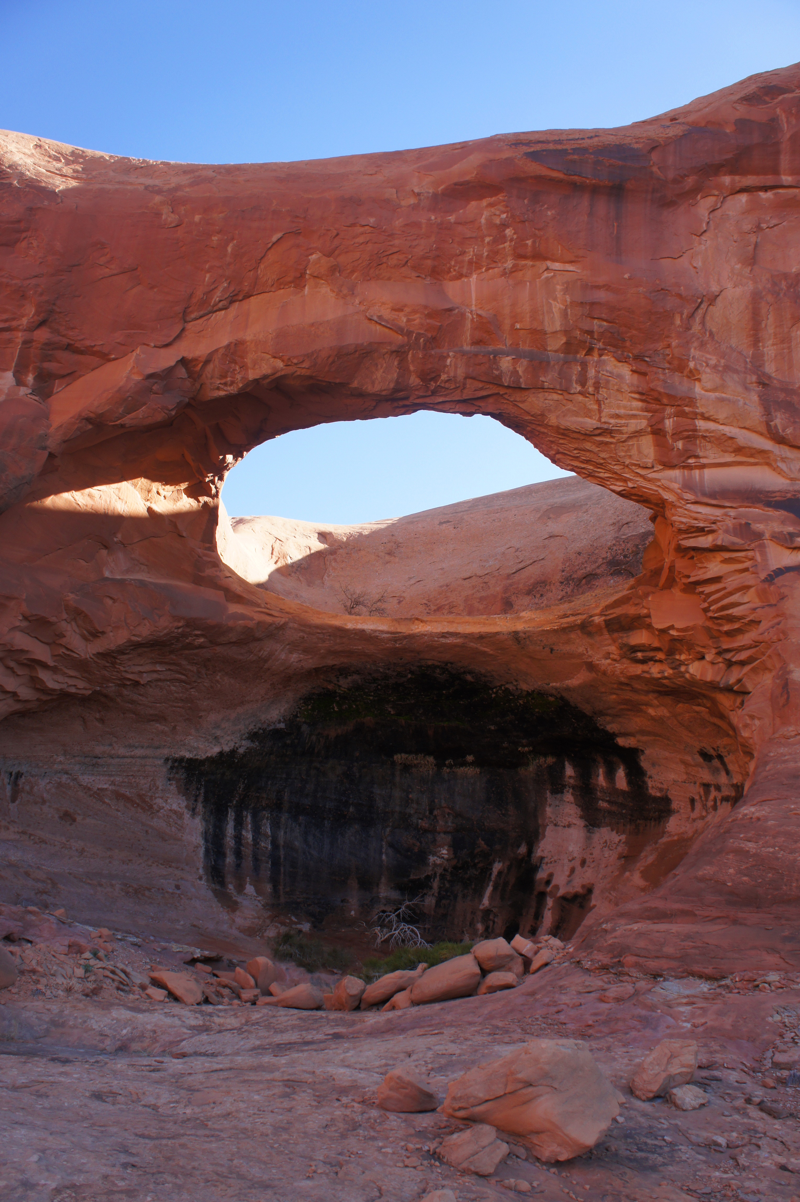 Reaching the span requires a bit of off-trail navigation—try to avoid cryptobiotic soil!—as well as a Class 3 climb up to a sandstone shelf that could be hairy for some. Immediately below the arch is an appealing alcove, stained with black varnish and scattered with mosses. If time and energy permits, the side hike to Pinto is a worthy endeavor, though it will add as much as a mile to your round trip.