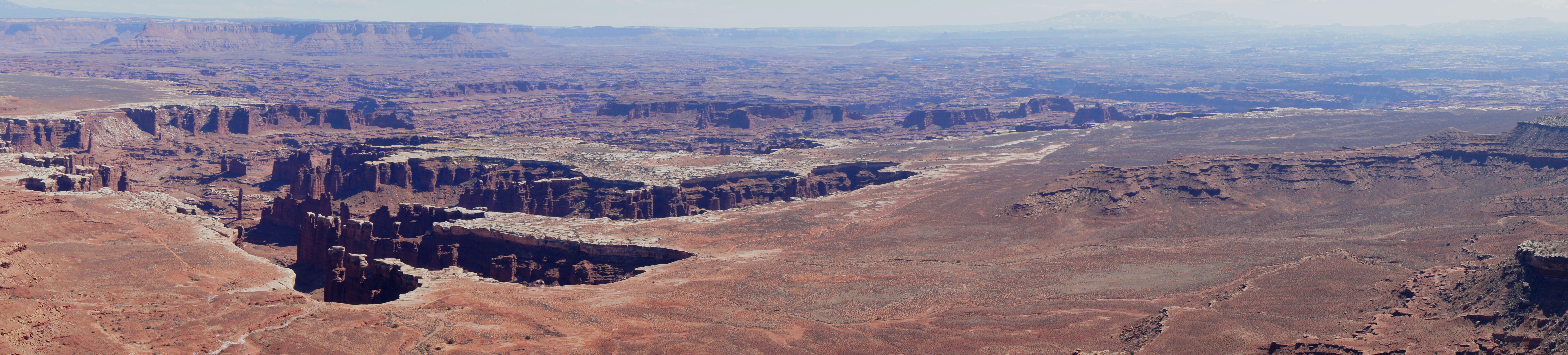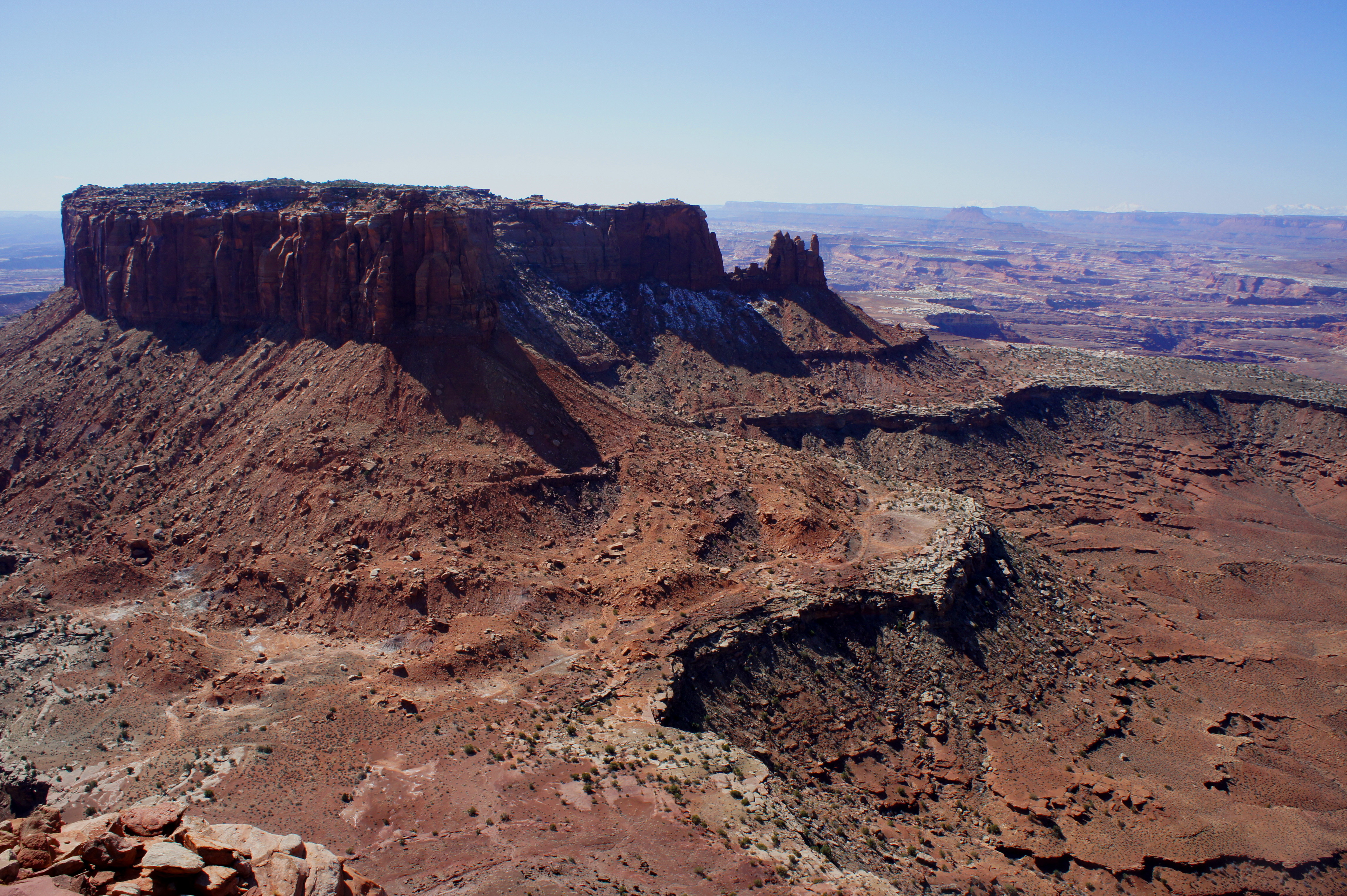 The vast plateau wrapping around Monument Basin—more than 1,000 feet below Grand View Point—is the White Rim, accessible only to hikers and four-wheel drive vehicles. Farther east is an intense maze of canyons, as well as the Colorado River, which—having formed a deep depression—is just out of view. On the horizon is another set of cliffs, of similar height and geological composition (Wingate and Navajo sandstone) as the Island in the Sky. Filling out the picture are the La Sal Mountains, providing a snowy contrast with the red-orange landscape in the winter months. As it faces east, the best time to visit the Grand View Point overlook is in the afternoon or evening.