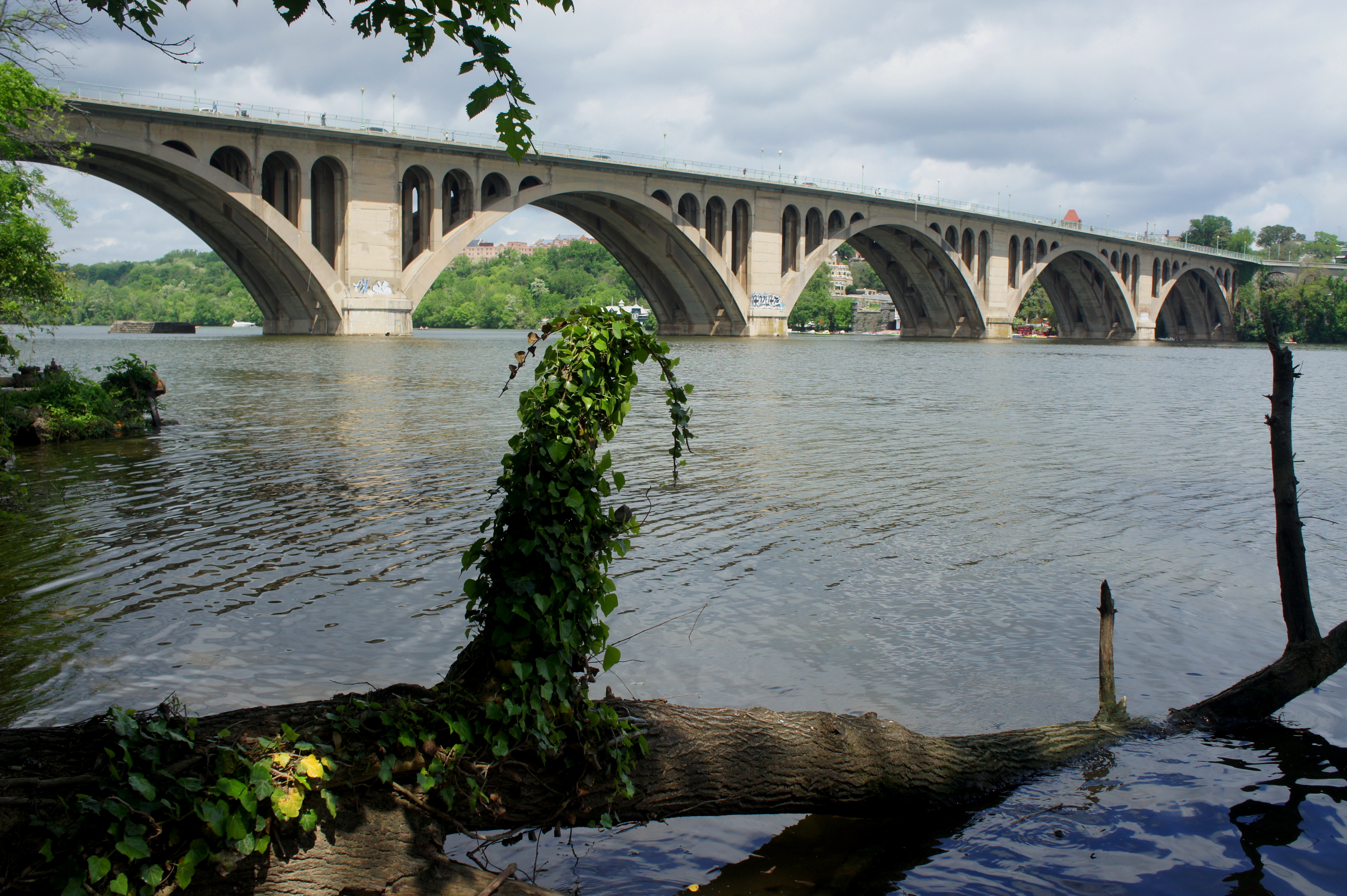 The narrow but well-worn trail begins by passing under a causeway (the Mount Vernon bike trail), then ventures past a couple open fields and into the woods. Following blue-green blazes, the trail soon approaches the Potomac River, offering views of the still waters, the Key Bridge, and the Georgetown waterfront (DC) beyond. Kayakers on the Potomac abound.