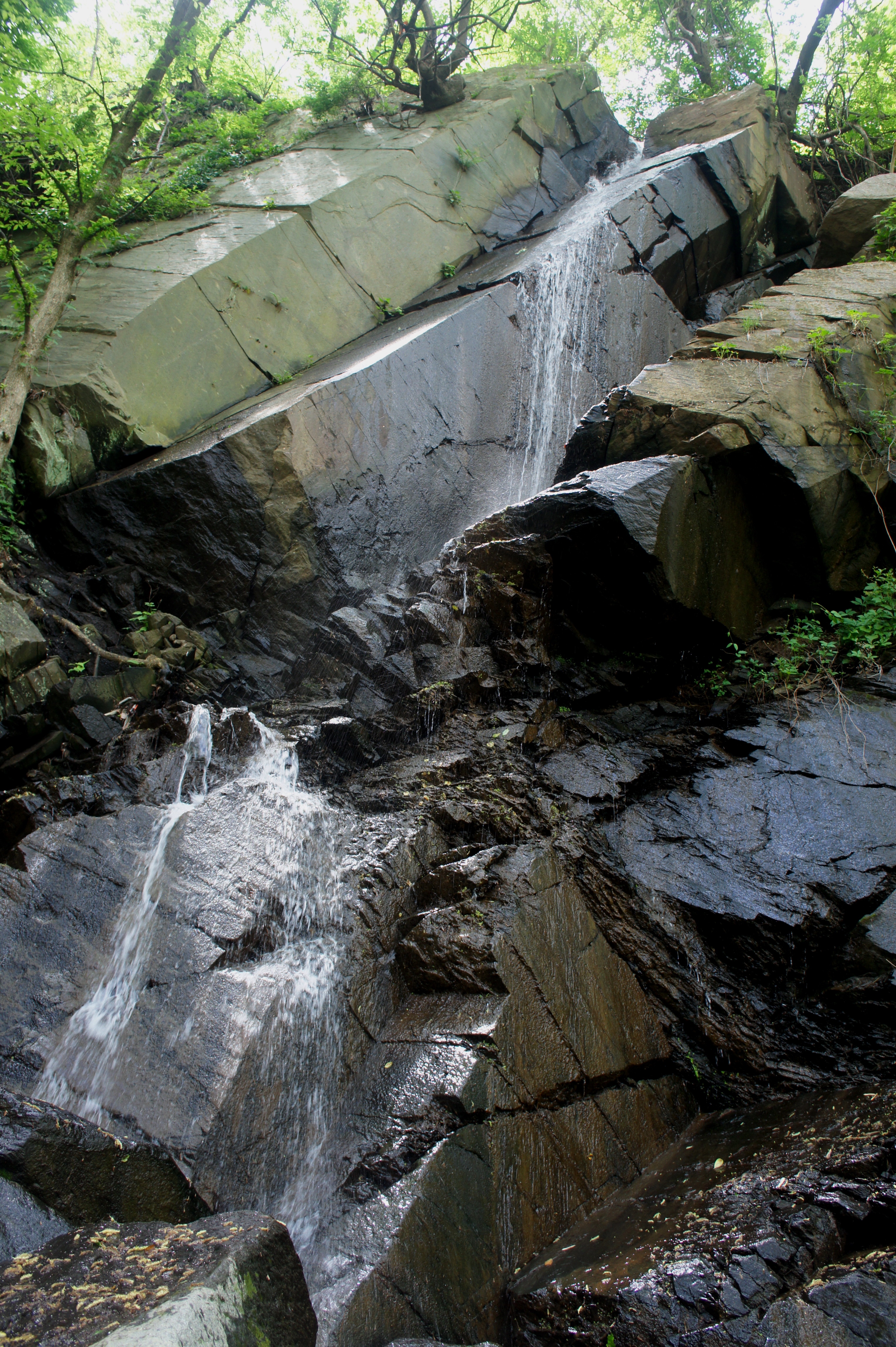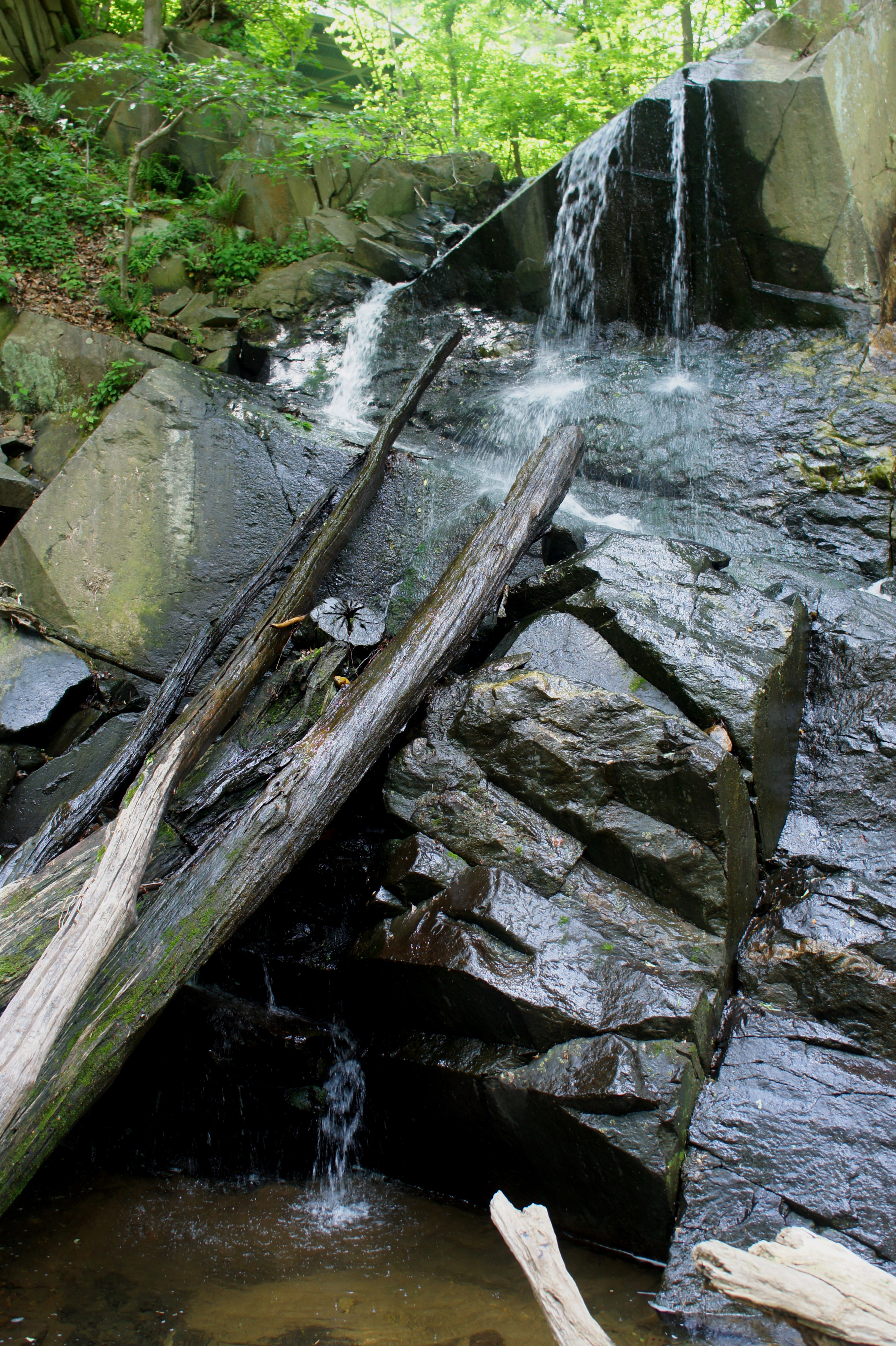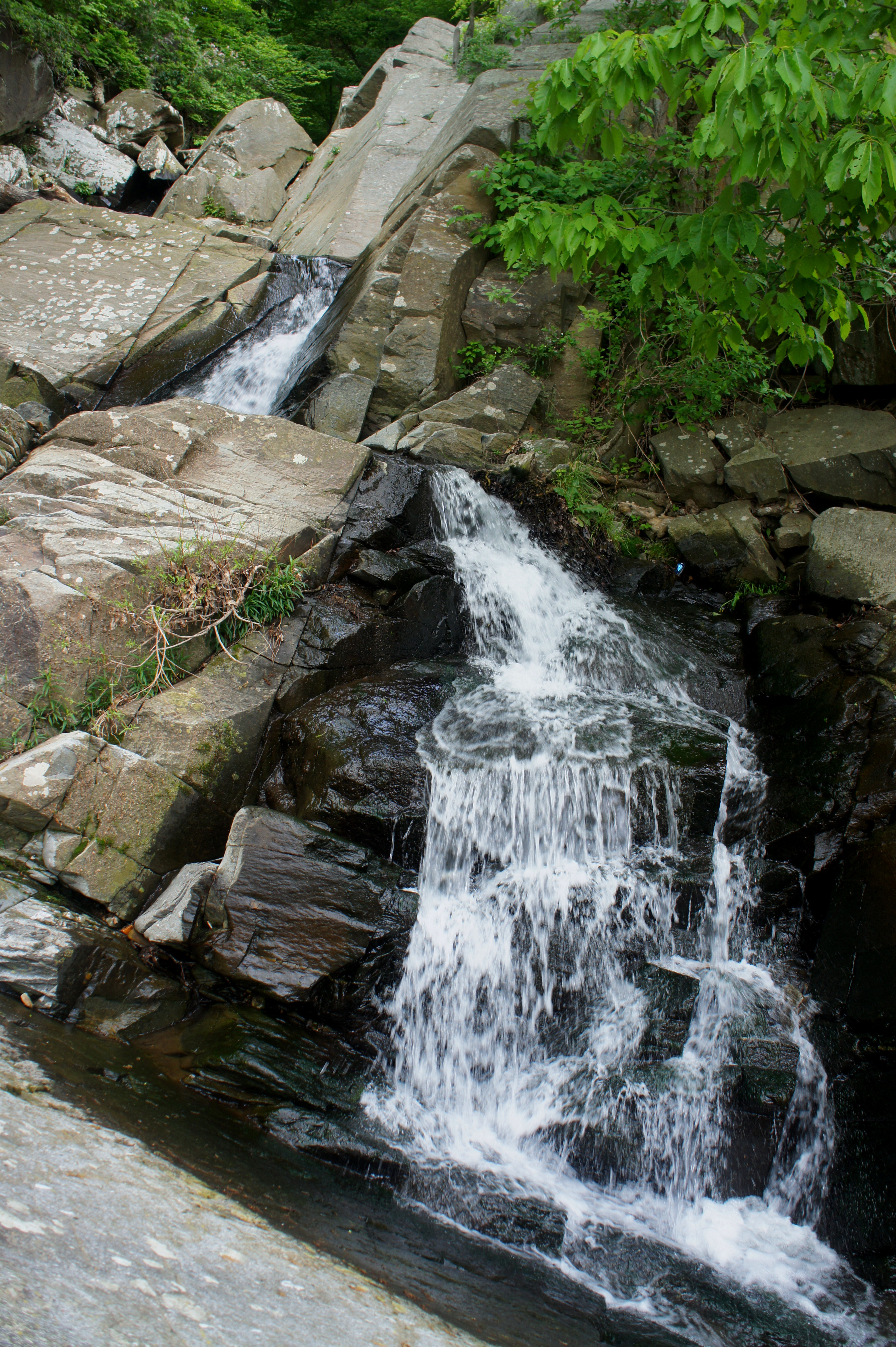 Roughly 10-20 minutes from Windy Run, another waterfall can be heard on the left. This one is more difficult to reach, but—flow permitting—can be just as impressive. Here the stream slides down a series of rocky steps perhaps 40 feet high, ending in a small pool.