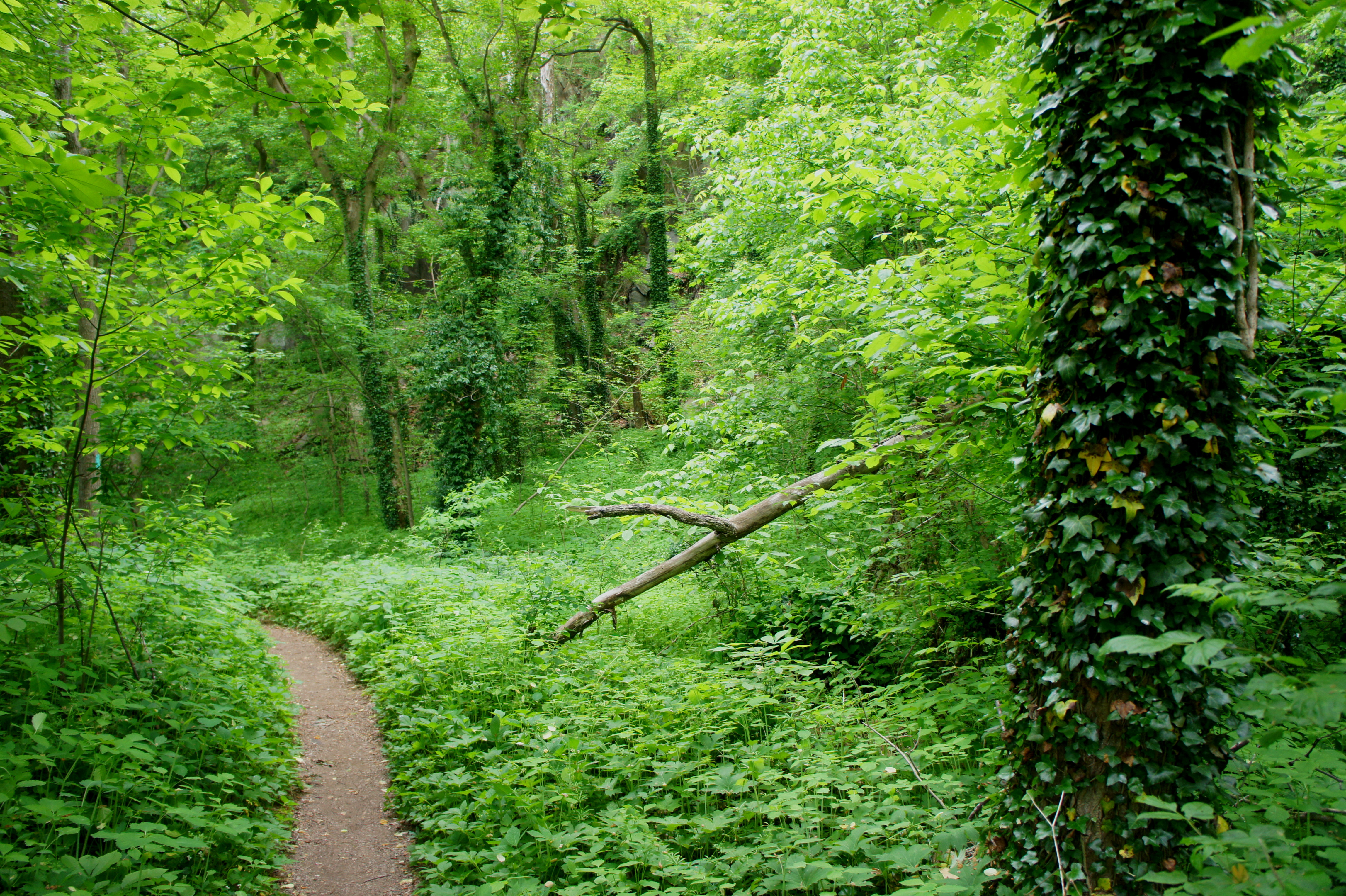 Past this second falls, the dense tree canopy and green understory thickens, obscuring the towering rock faces off to the left. A few historical remnants of 19th or early 20th century Washington can be found scattered about—exposed pipes, old storage sheds, etc.