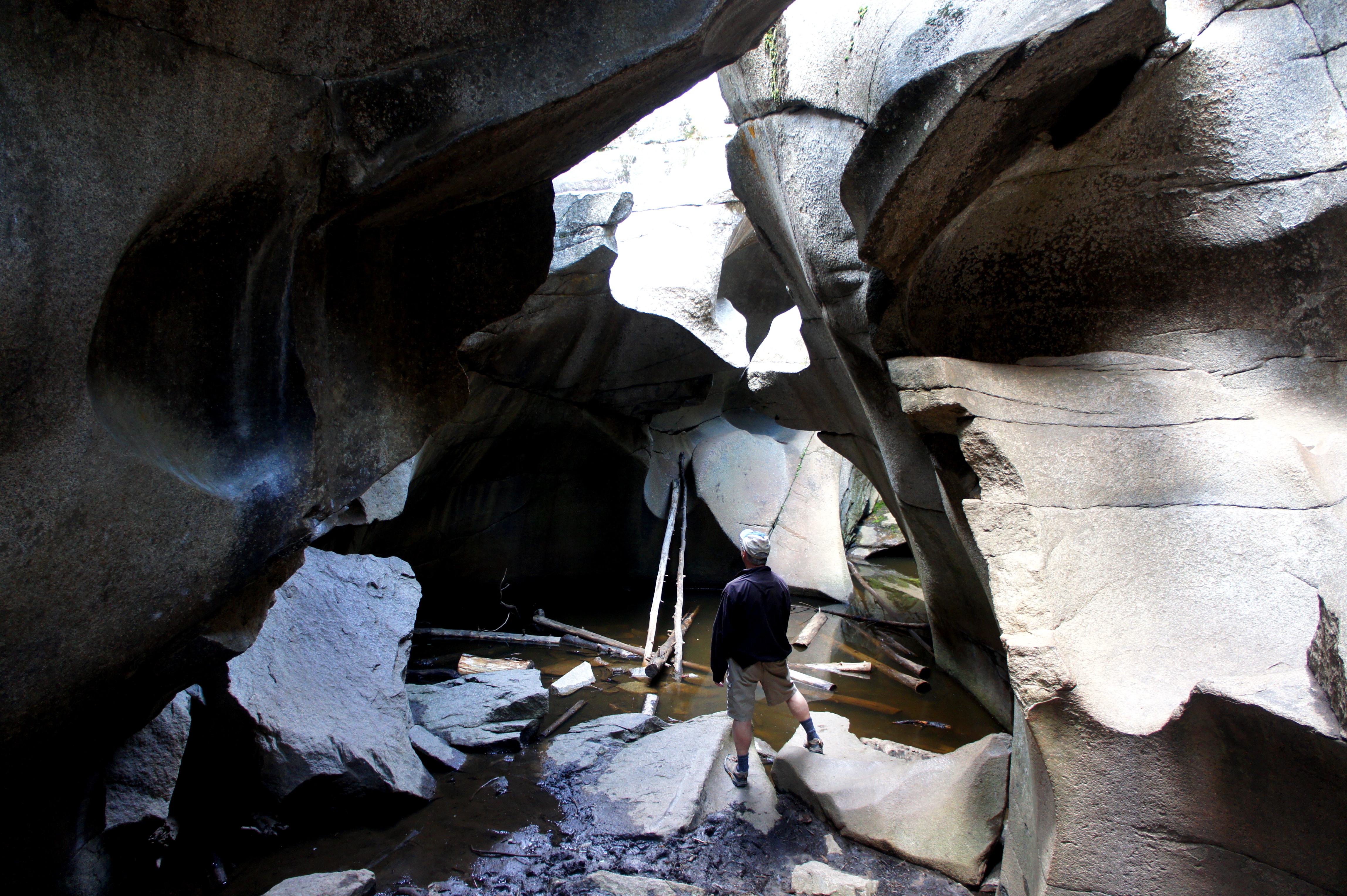 After spending a good while taking in the unique sight, shimmy back up the pinch and out of the ice caves, then return to the main trail. The route winds east, then north, and crosses a wooden bridge at a second entrance to the ice caves, this one far more treacherous. Here the slot cuts some 30-40 feet deep into the granite and narrows to about 3-4 feet wide.