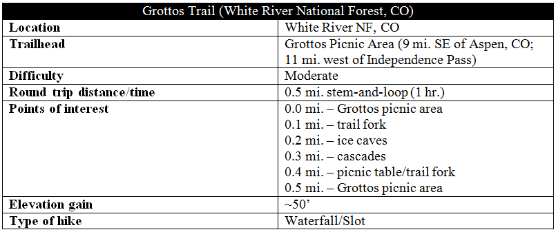 Situated just off Colorado’s Highway 82 west of Independence Pass, the short but spectacular Grottos Trail is a must-see in the Aspen-Leadville area. In the course of 1/2 mile, the stem-and-loop visits both a splendid set of tumbling cascades on the Roaring Fork River and an undulating slot canyon, the latter a rare sight in Colorado. Nominally known as the “ice caves,” this dazzling chasm requires a bit of climbing skill to reach—but the rest of the circuit hike is relatively straightforward as it winds around and over huge hunks of smooth granite.