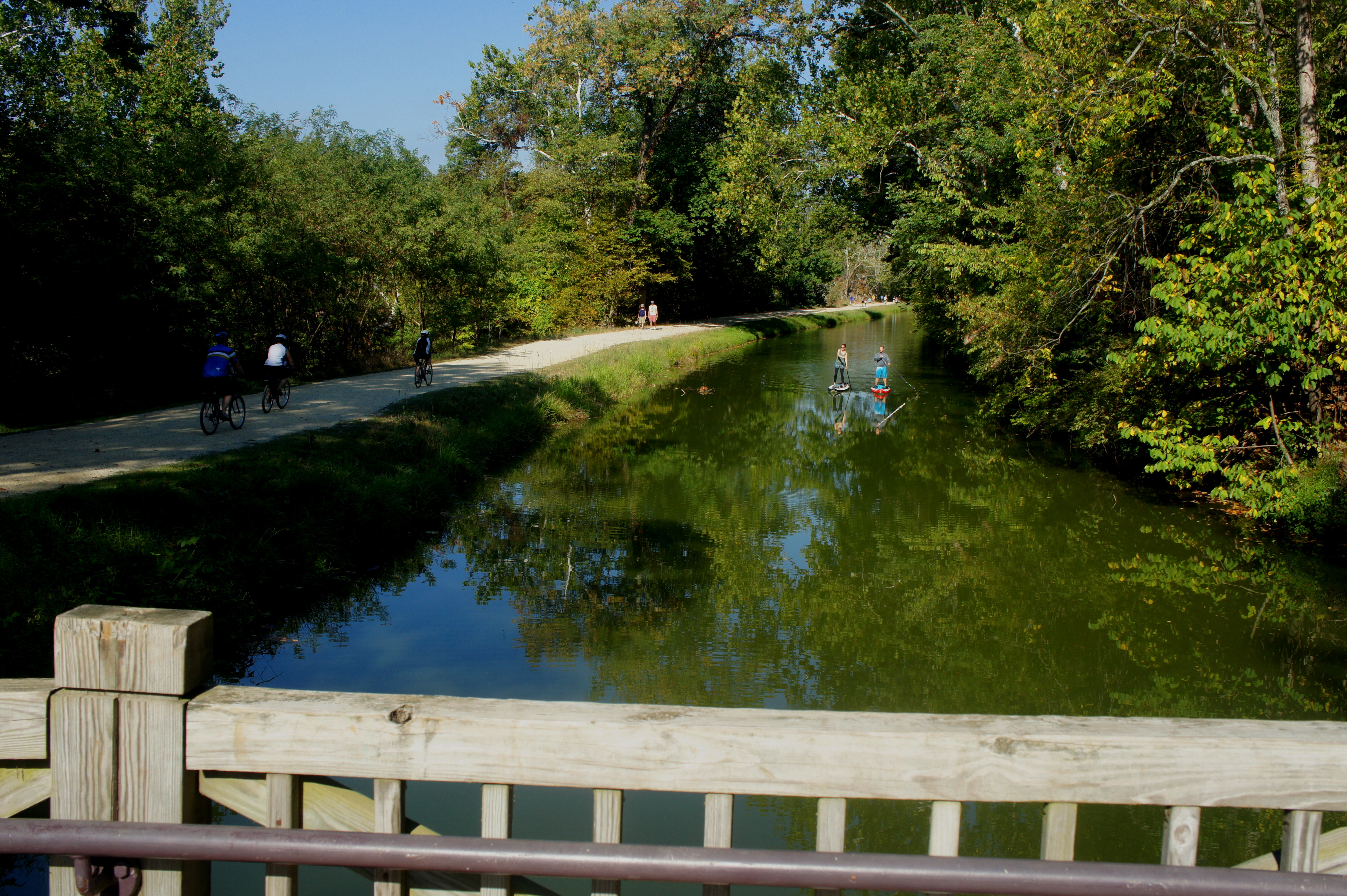 Less than ¼ mile from the end of the trail, the rocky topography eases, giving way to a smooth, dusty pathway as the route rounds a corner away from the Potomac. Around 1.7 miles from the beginning, the trail returns to the Towpath—about 1 ½ mile northwest of Anglers. The return journey is pleasant enough, passing a covered bridge, two old canal locks, and the glistening Widewater pool.