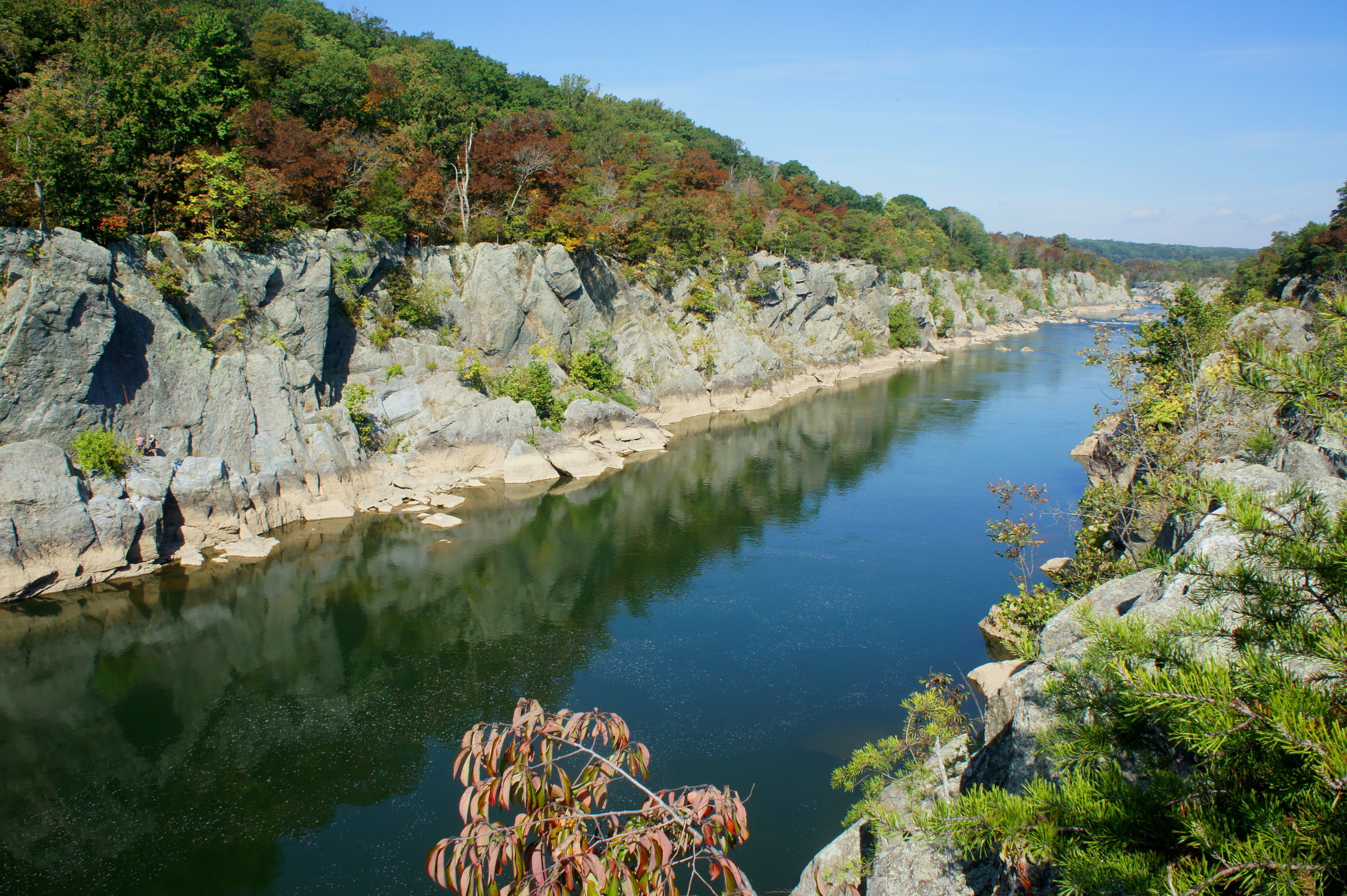 A little over 1/3 mile from the start of the Billy Goat route, the path crests a stony outcrop offering an excellent vantage point of the Potomac River. Opposite the waterway lies the state of Virginia—more precisely Great Falls Park—as well as the mouth of Difficult Run, a significant tributary.