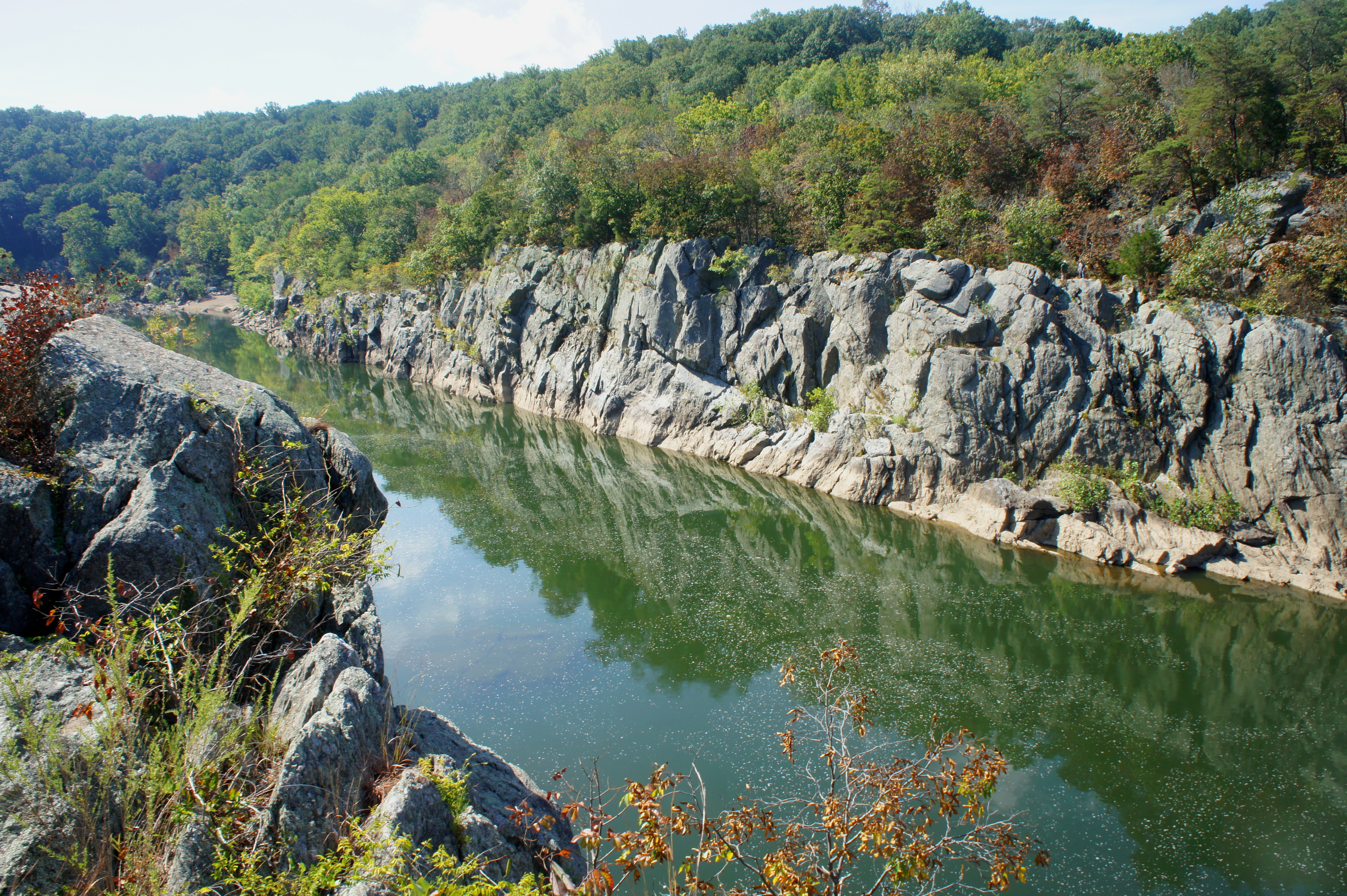 From the Anglers parking area, bear southwest downhill toward the canal—through a second parking lot—to a large interpretive sign displaying maps of the Great Falls area and beyond. Bear left and cross a bridge spanning the channel, then turn right onto the Towpath Trail. From here, it is around ½ mile to the southern terminus of the Billy Goat Trail. Along the way, enjoy one of the prettiest sections of the C&O Canal—Widewater, a broad pool bounded to the north by craggy greywacke, the predominant rock type in the area.