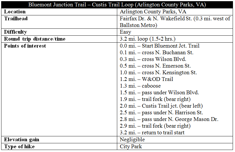 Cutting southwest through the Bluemont section of Arlington, Virginia, the paved and accessible Bluemont Junction Trail traces an old railroad line constructed in 1912. Together with segments of the Custis and Washington and Old Dominion (W&OD) Trails, the Bluemont Junction path forms a 3.2-mile loop starting and ending near the Ballston Metro Station. Have no doubt about it: buzzing with bikers and runners, this is a suburban track that is rarely out of sight or sound of houses or highways. But towering trees and historic relics offer at least a modest sense of escape from the bustling Washington, DC metro area.
