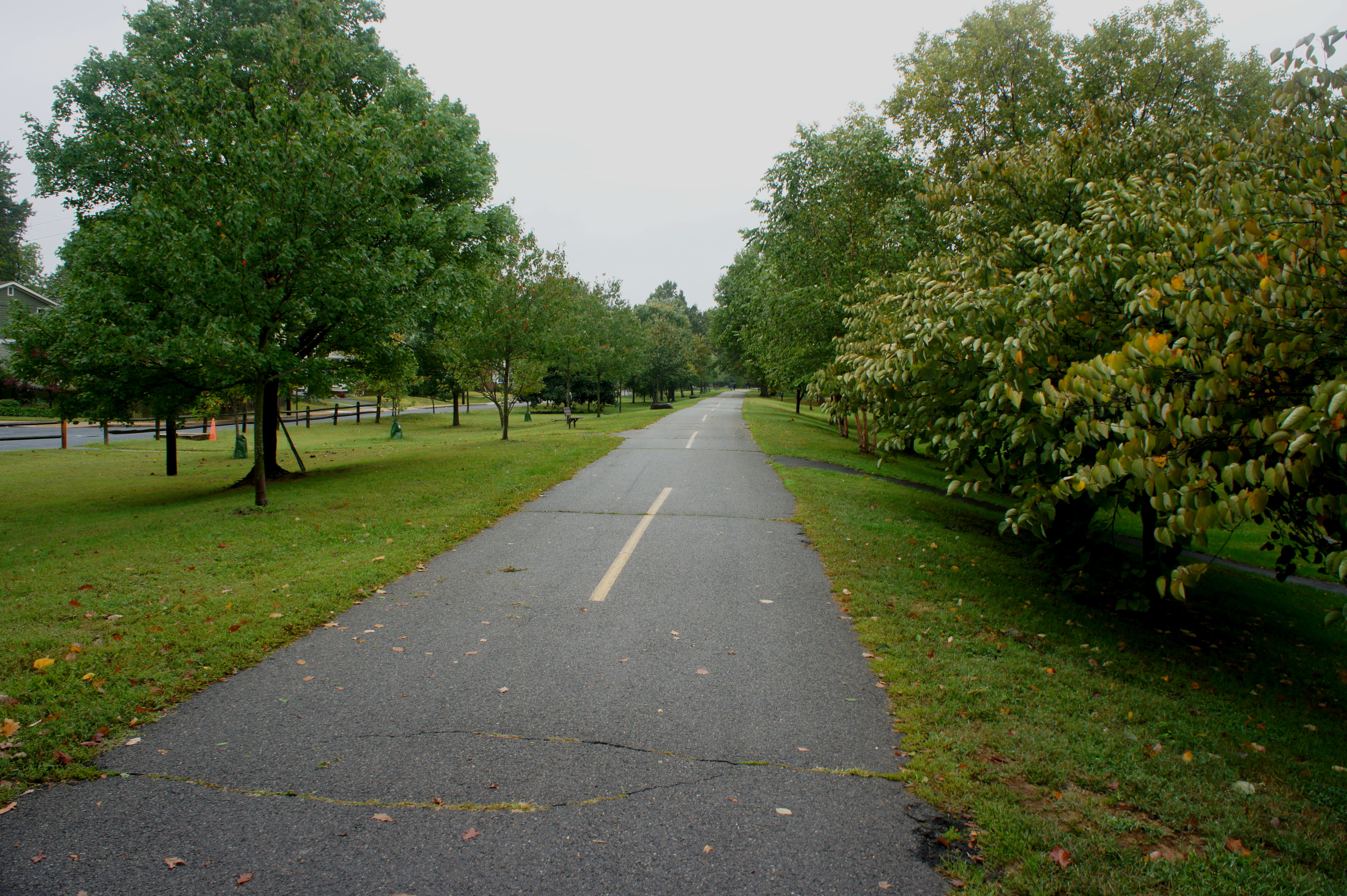 Next the Bluemont Junction Trail follows parallel rows of neatly planted trees, including an array of rosebuds, oaks, zelkova, and others. After a couple minutes, a soccer pitch emerges on the right, the centerpiece of so-called Fields Park. Around 1/3 mile into the walk, the trail crosses Wilson Boulevard and North George Mason Drive, continuing to cut southwest through the Bluemont community. Pick up the trail again after briefly following a minor paved road.