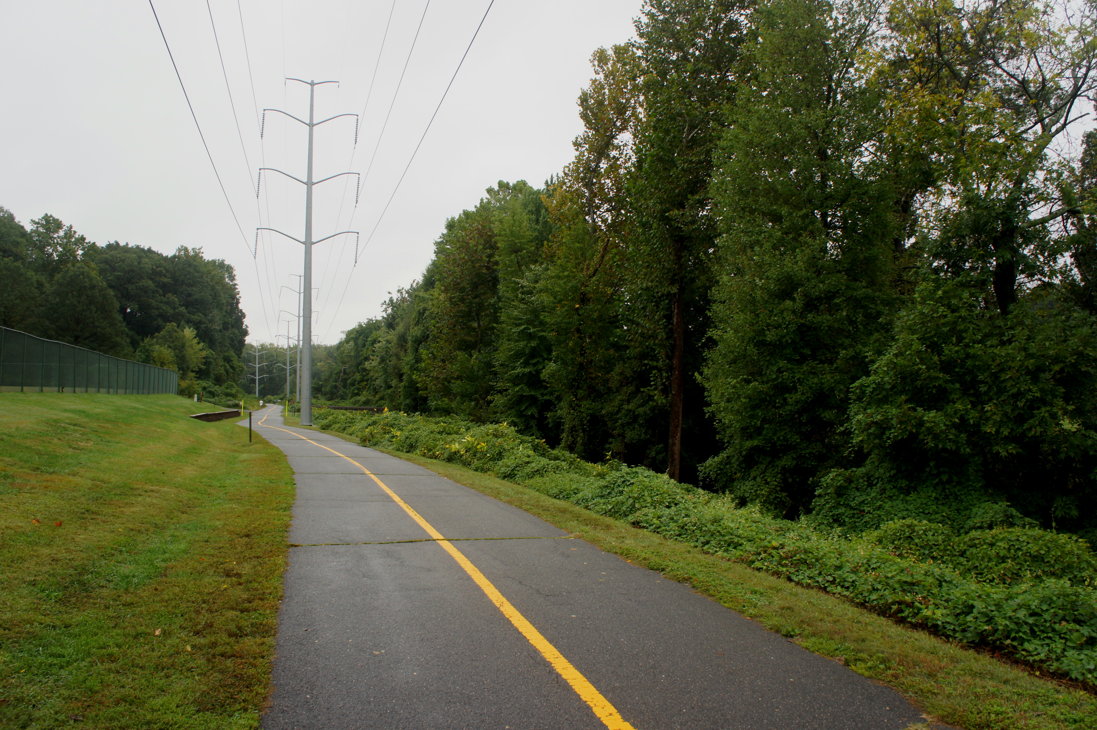 The clearing once developed for the railway is now home to a mammoth string of modern power lines, with the W&OD Trail below. Shortly after the caboose, the trail crosses cover Four Mile Run as it traverses Bluemont Park. Bear right as the path edges toward the west bank of the creek and passes under Wilson Boulevard.