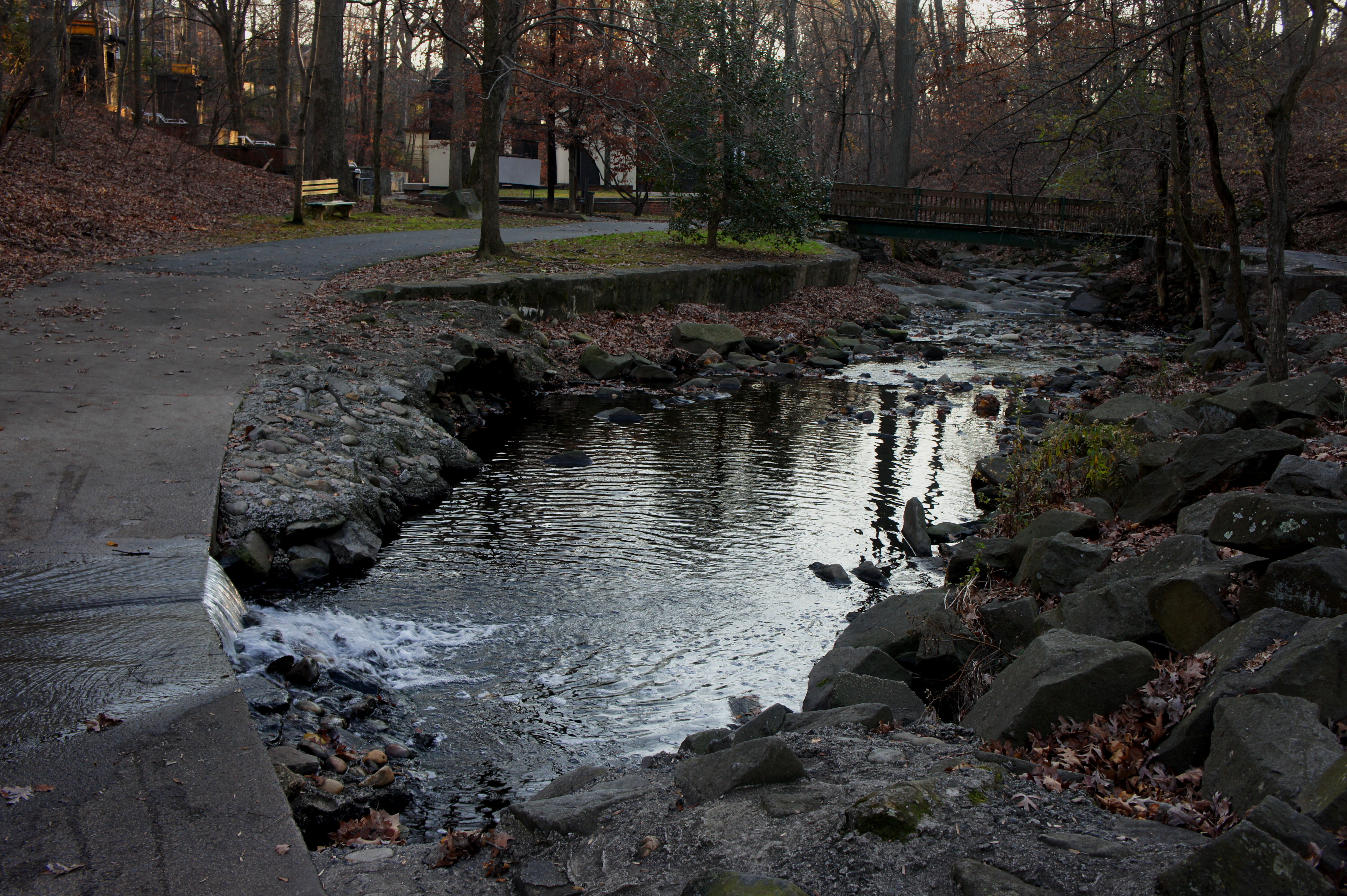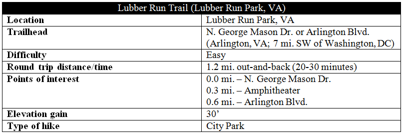 Far from Arlington’s finest, the Lubber Run Trail nonetheless offers a pleasant, paved stroll through a pretty stream valley south of Ballston, Virginia. The namesake creek is flanked by thousands of gray stones, and a series of minor dips make for some trickling cascades. Picnic tables abound, and a gargantuan outdoor amphitheater marks roughly the halfway point between North George Mason Drive and Arlington Boulevard.