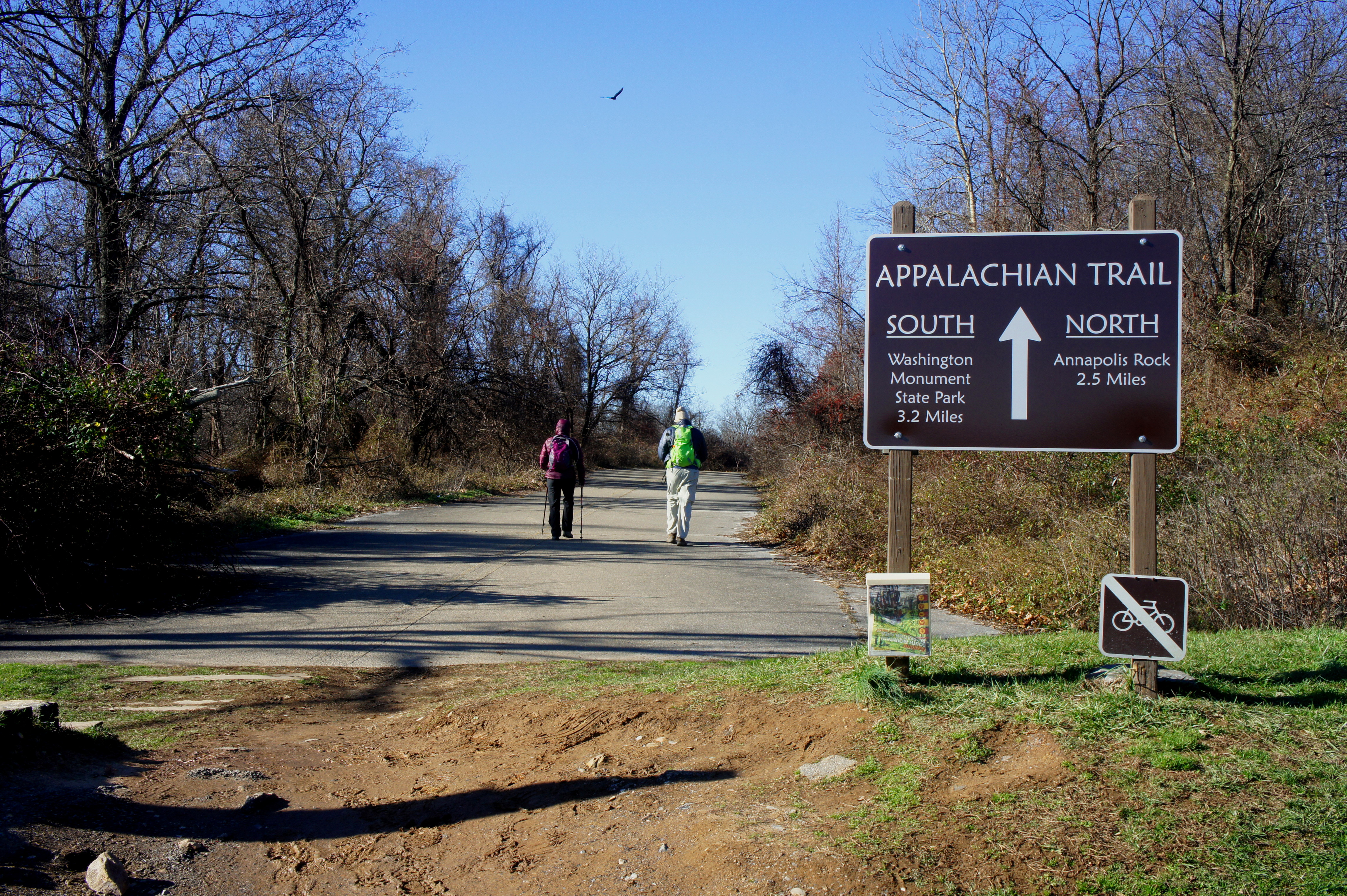 The trail starts at the west end of the parking lot, marked with a giant brown sign titled “APPALACHIAN TRAIL.” (Note: The beauty of the AT is that is usually very well-marked.) The first 100 yards follow a paved but unused road; at the end of the strip, the AT dives into the woods off to the left. The route bends south, then west, and quickly leads to a significant trail junction. A left takes you southbound on the AT, over I-70, toward Washington Monument State Park; bear right to head north toward Annapolis Rocks.