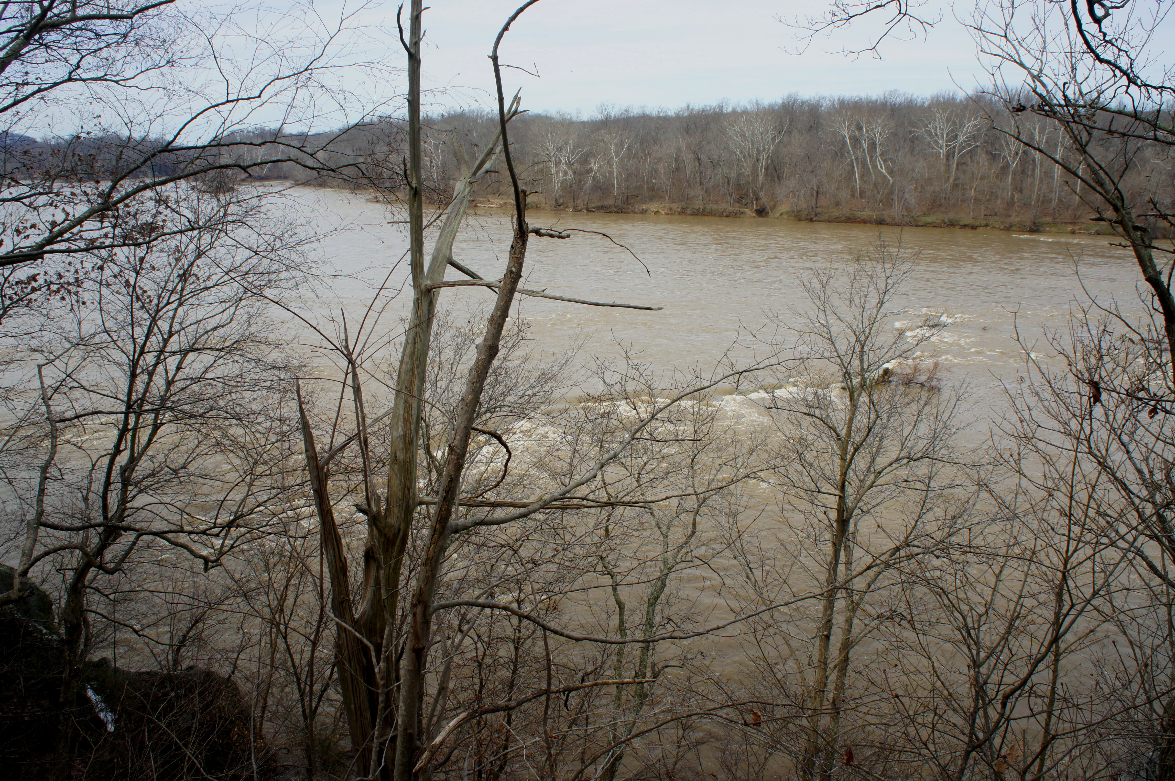 Scott’s Run Falls drops only 12 feet, but its significant water flow and attractive plunge pool makes it better known than its higher neighbors (e.g., Dead Run, Windy Run Falls). The falls slice through a wall of greywacke sandstone and feed almost directly into the Potomac, situated in plain view off to the right.