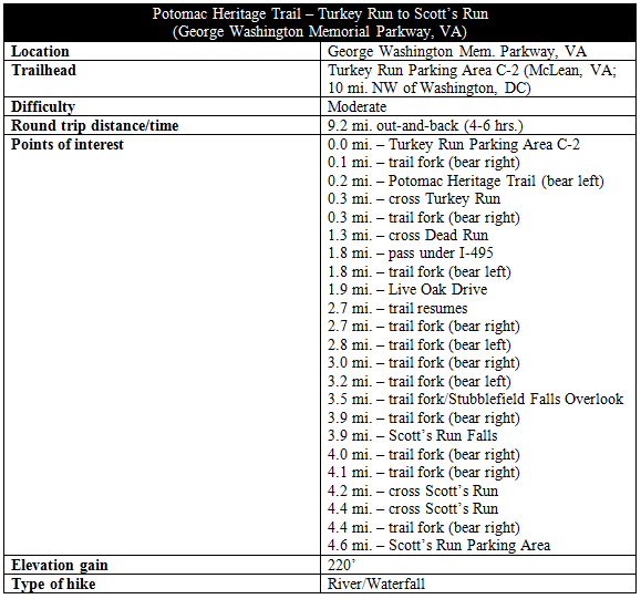 This 4.6-mile ramble from Turkey Run Park to Scott’s Run Nature Preserve in McLean, Virginia constitutes the third section of the Potomac Heritage Trail heading westward from Rosslyn in Arlington. (Note: Descriptions of the two preceding sections—Roosevelt Island to Fort Marcy and Fort Marcy to Turkey Run Park—can be found here and here, respectively.) Despite a handful of steep climbs, it is arguably less challenging than other sections downstream and features riverside views and three beautiful creeks, each with tumbling cascades feeding into the Potomac. A short detour to Scott’s Run Falls punctuates the scenic walk. Park one car at Turkey Run and a second at Scott’s, or return the way you came for a 9.2-mile out-and-back (or shorter, if you take a shortcut route through Scott’s Run Nature Preserve).