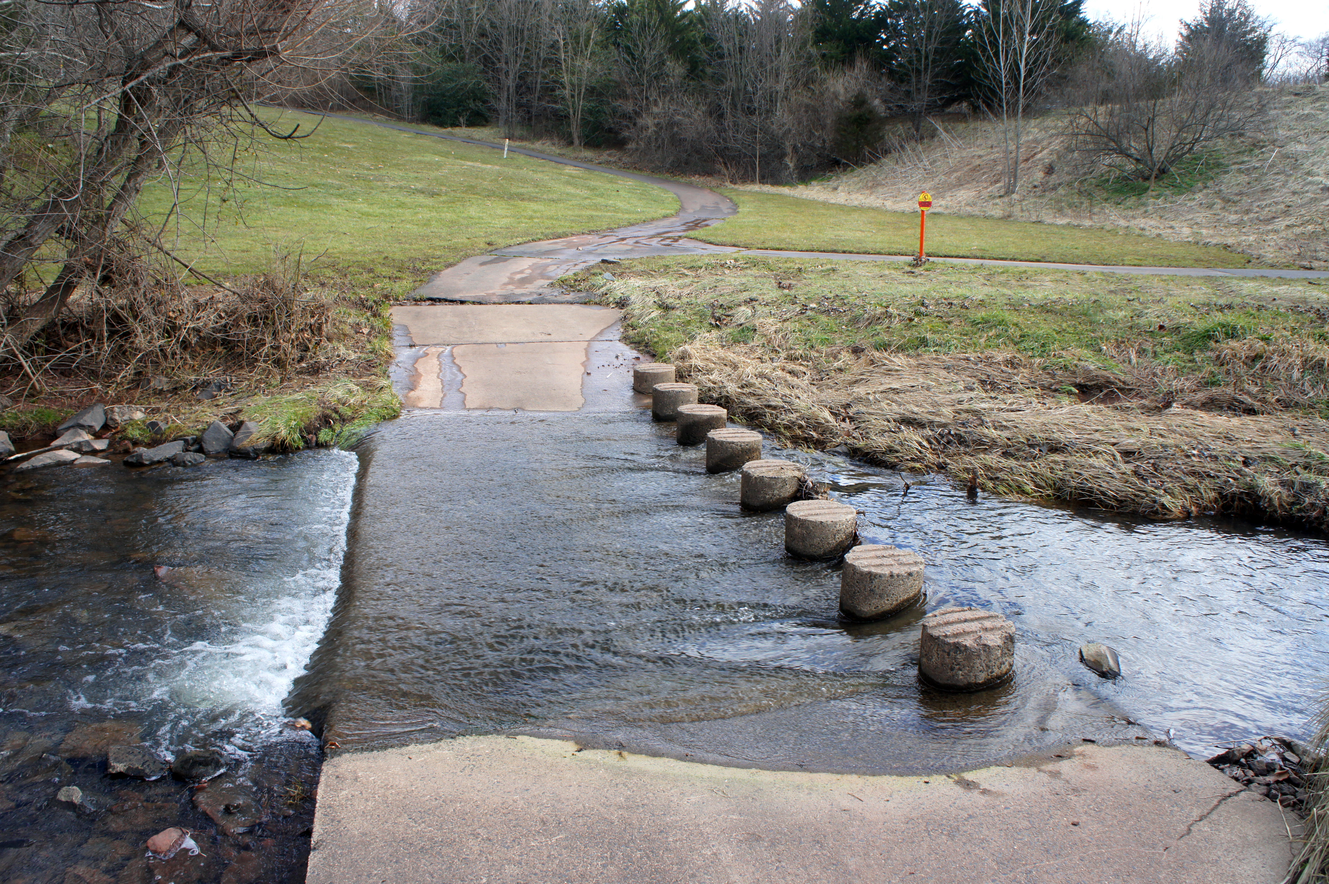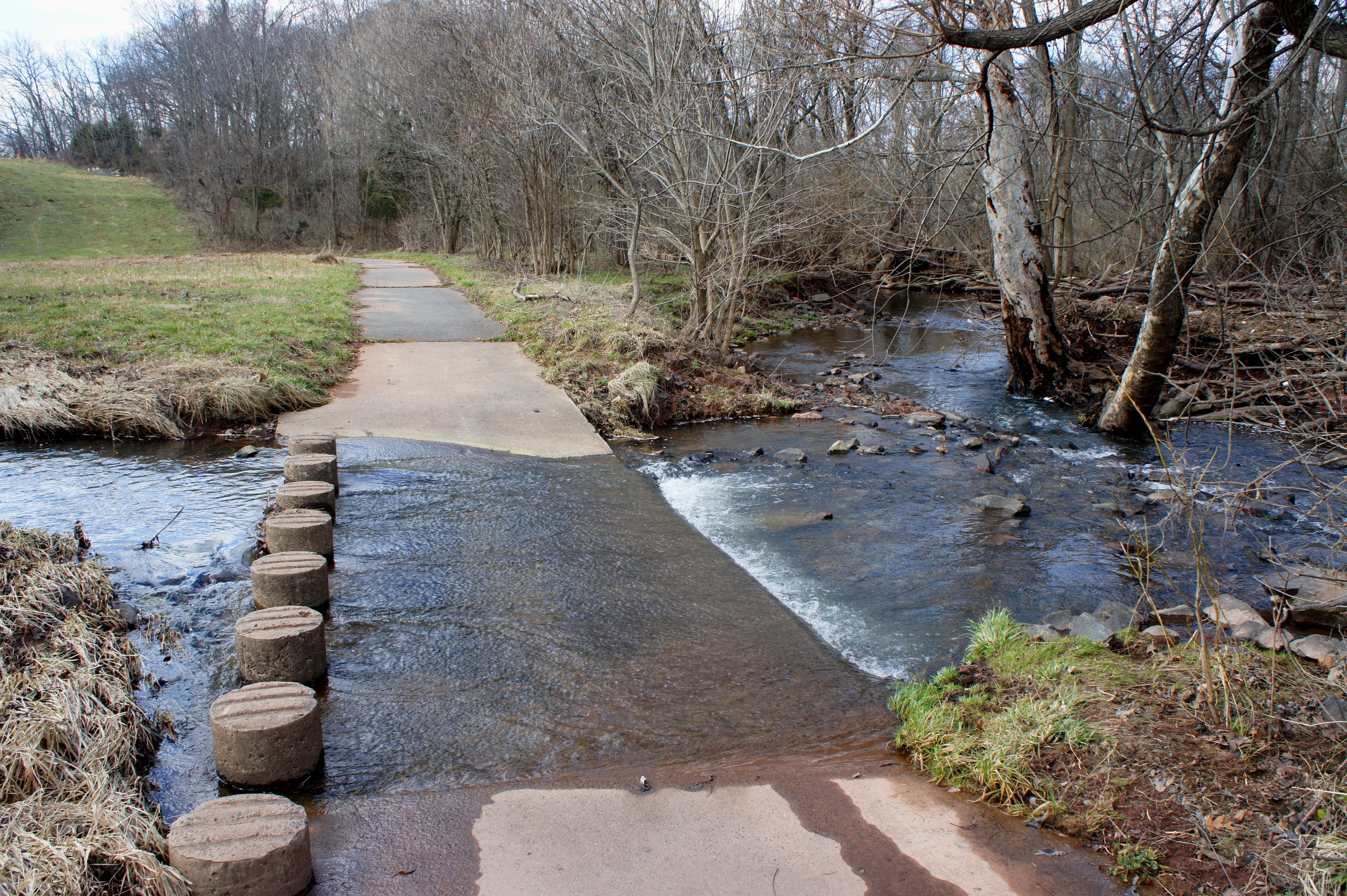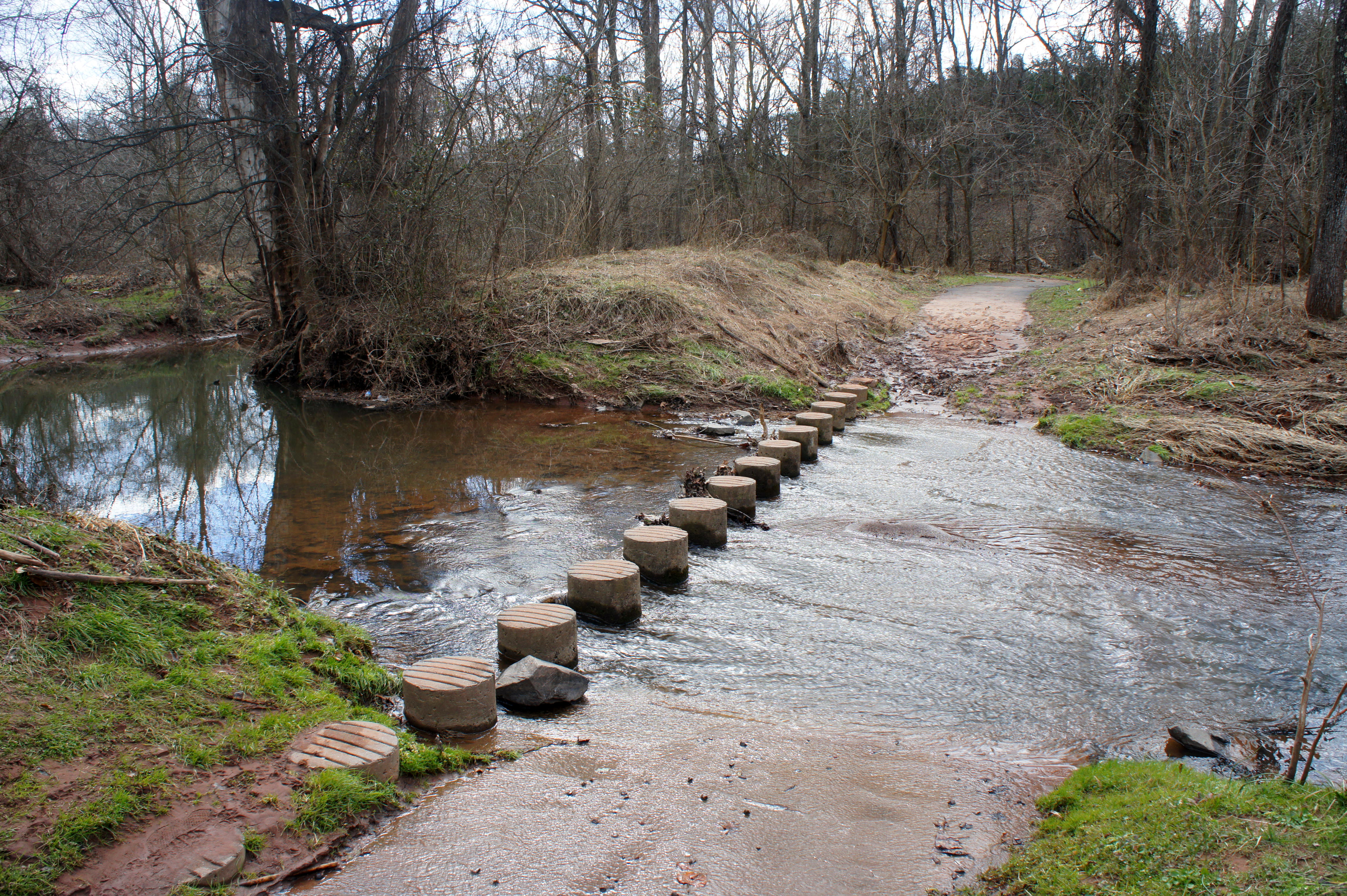 At around 4/10 mile, the now-level trail splits, with a small suburban playground and a pair of picnic tables on the left. Stay right and follow the path around a bend to the first of three creek crossings. The relatively straightforward traverse is assisted by 16 concrete stepping stones.
