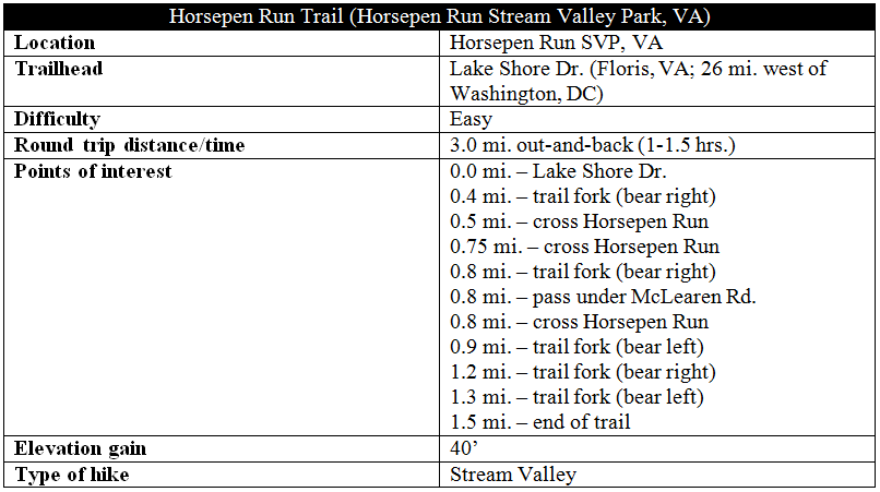 Horsepen Run (a.k.a. Horsepen Creek) is a modest stream winding through northern Virginia’s Loudoun and Fairfax Counties. Situated in the unincorporated community of Oak Hill—between the Dulles Toll Road and Interstate-66—the paved Horsepen Run Trail runs alongside the creek for 1.5 miles. To be honest, there’s not much to it—the stream, while pretty and calming at times, lacks the rocky crags and cascades of some of its neighbors. But in a relatively featureless area where the most notable sight is one of the world’s worst airports, it’s better than nothing.