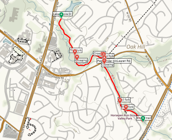 With the noise of Fairfax County Parkway looming ahead, the Horsepen Run Trail ends abruptly, 1.5 miles from Lake Shore Drive. A social trail continues down to the creek (now around 4 feet wide and a few inches deep), but continuing onward is discouraged. The underpass below the Parkway is dark, damp, long, and cramped, with little expectation of rewarding scenery beyond.