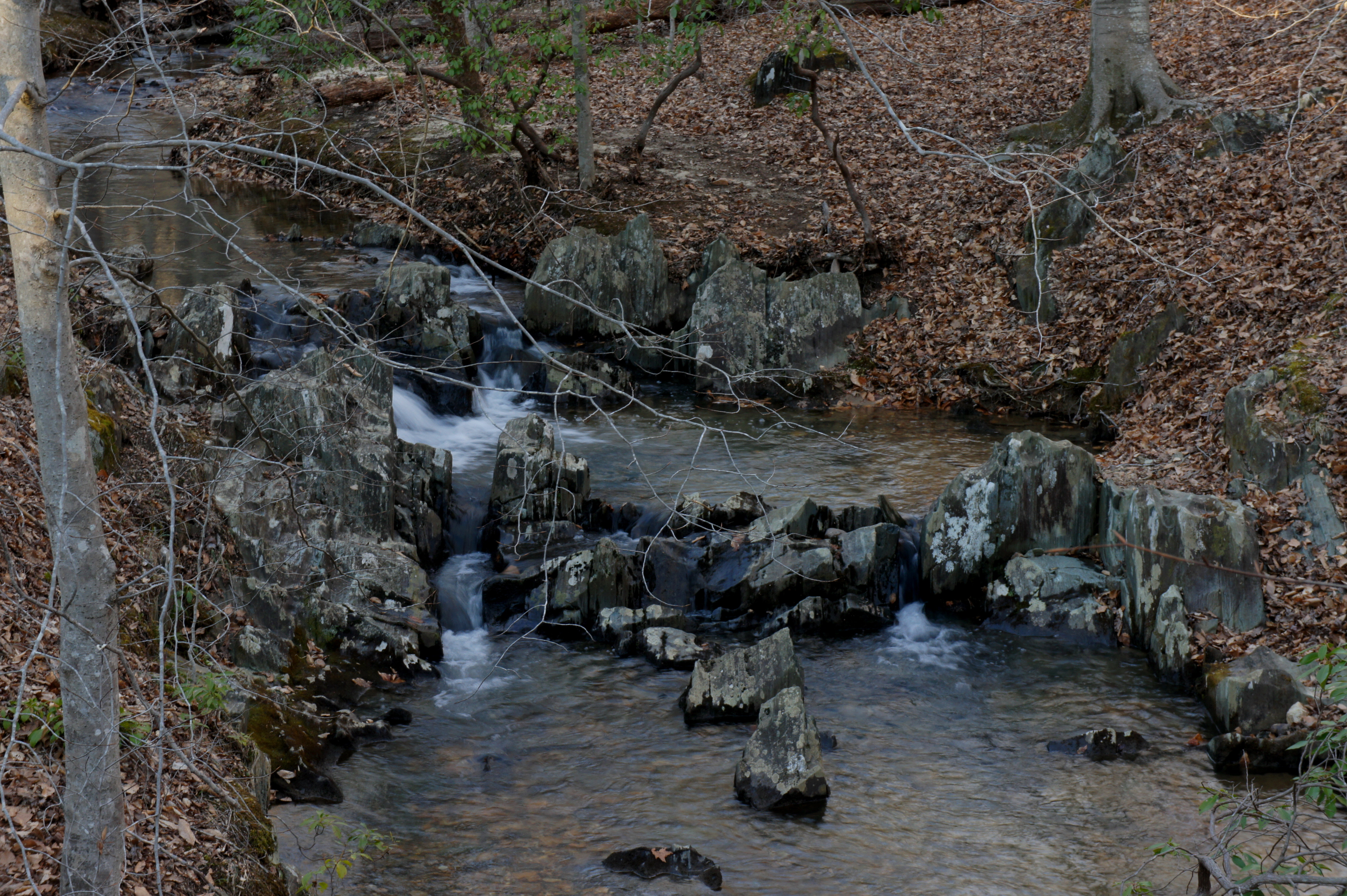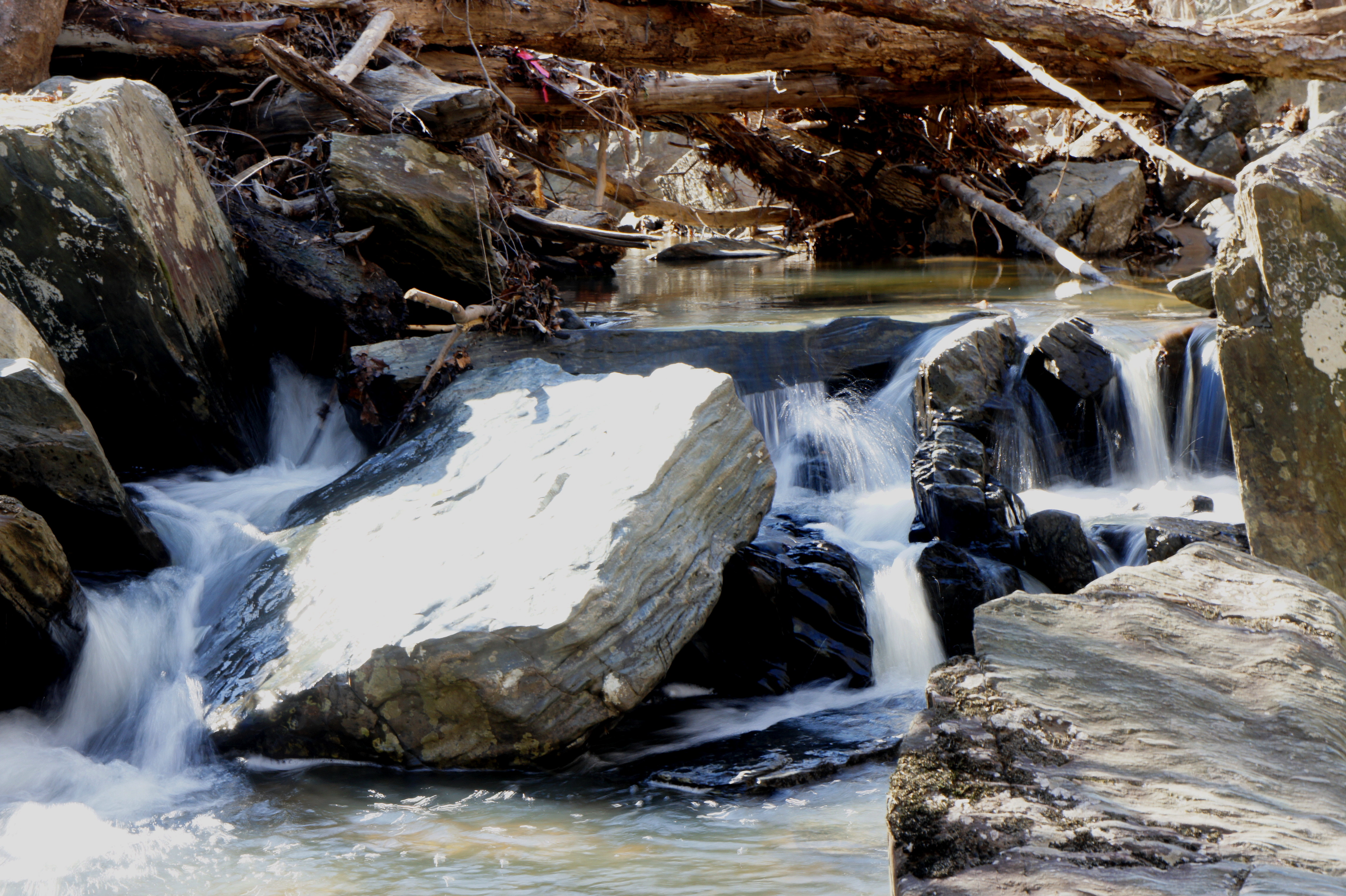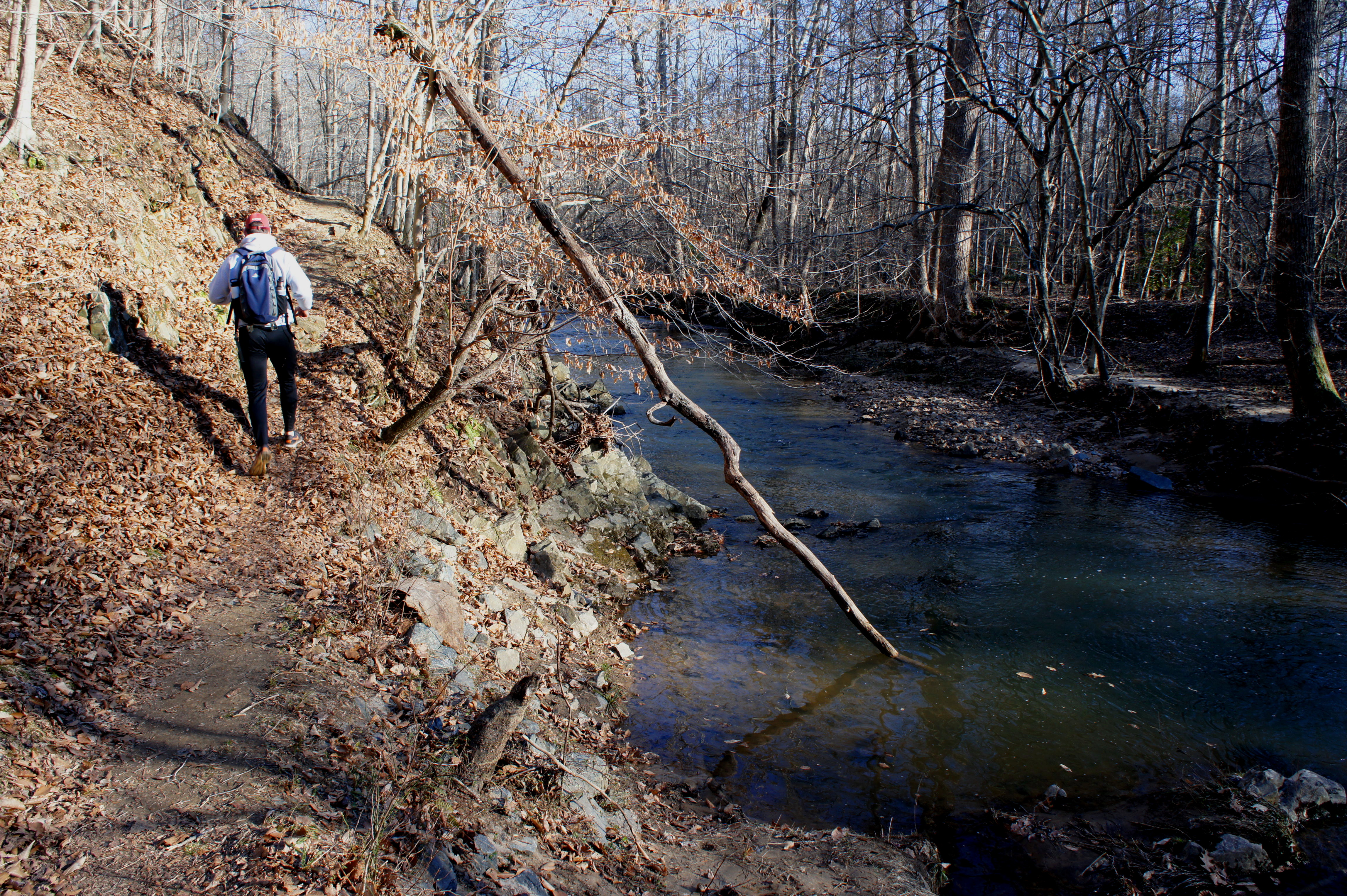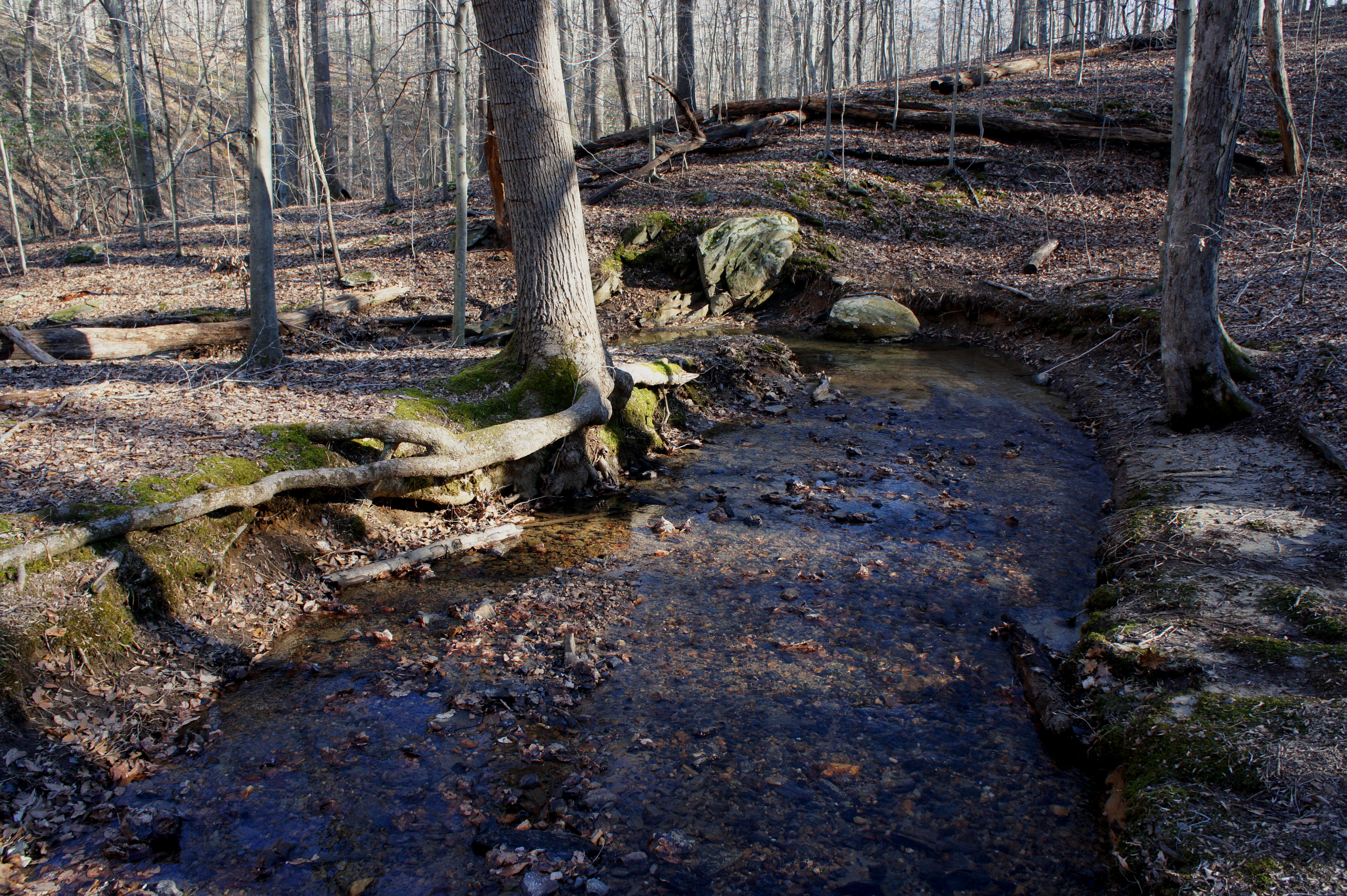 From here, follow the South Valley Trail northward as it traces the South Fork of the Quantico downstream. Slicing through the opposite bank, a noisy tributary drops into the creek. Around 8/10 mile from the trailhead, look for a set of minor cascades on the right as the creek rounds a left-hand bend.