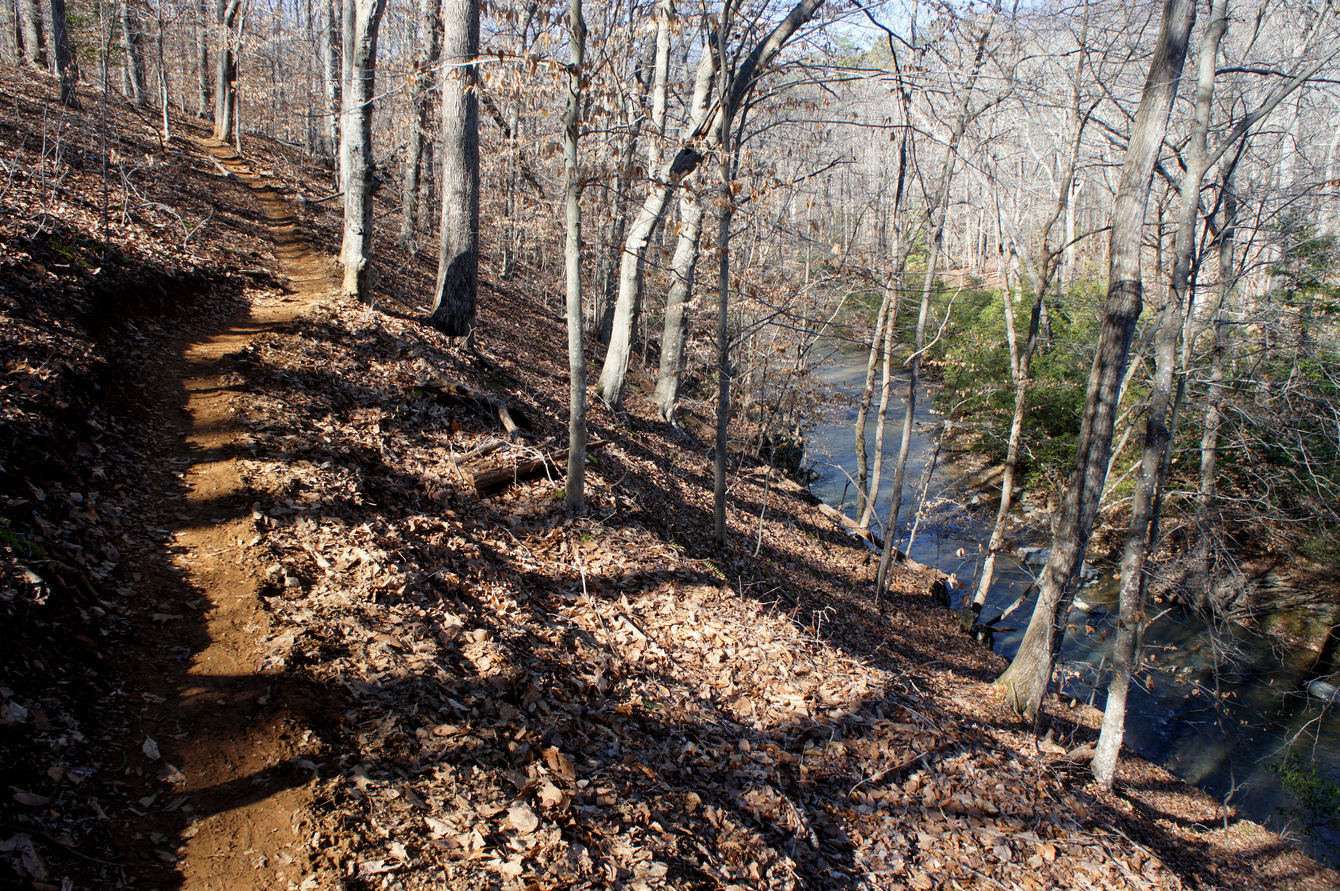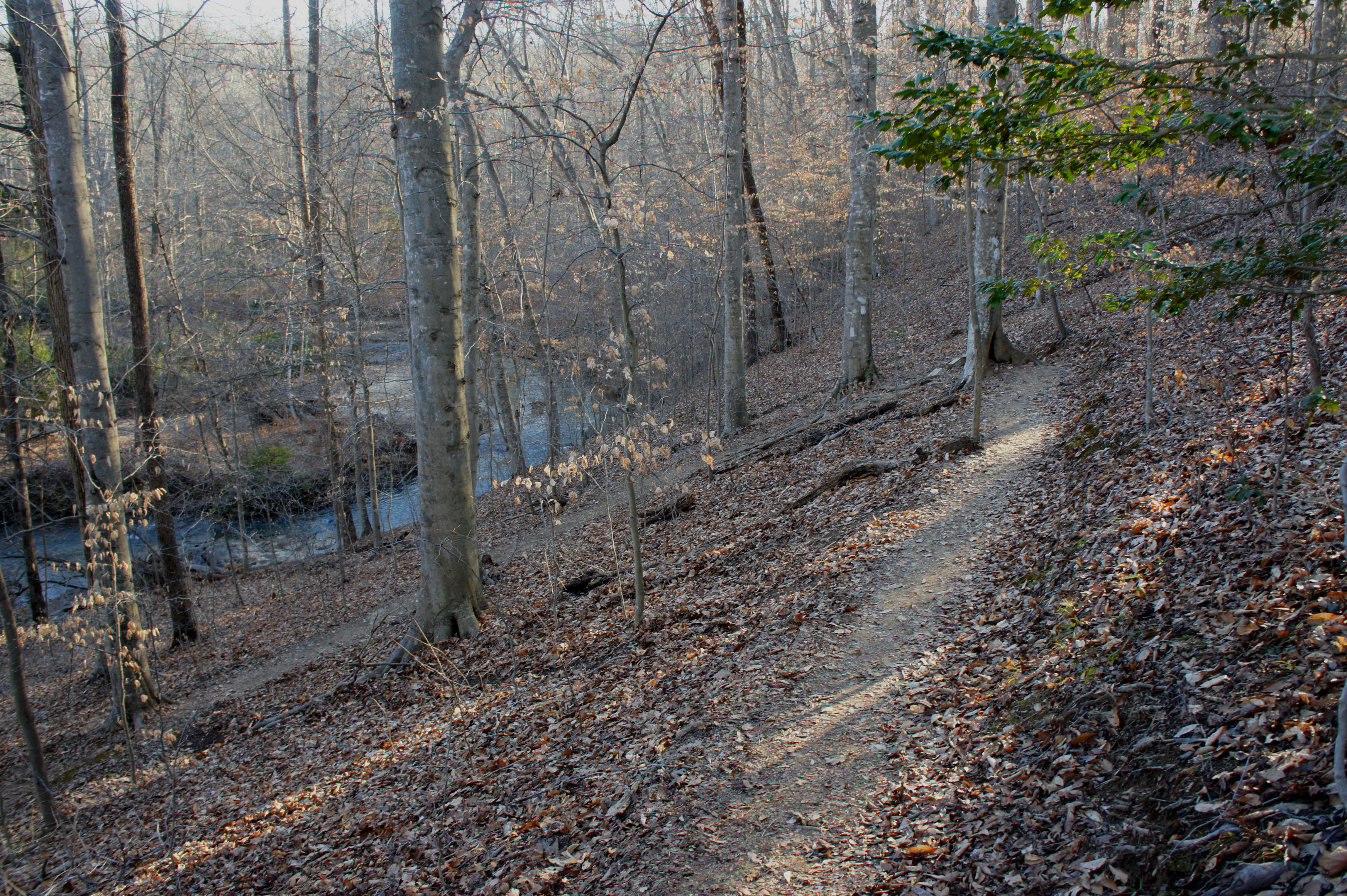 At 6.5 miles, the trail splits, with the Turkey Run Ridge Trail bearing off to the left. Stay right, entering an area of déjà vu, where the trail mimics the sharp left-hand bend and sudden uphill of the previous mile. This time the trail stays high above the South Fork for a longer period but eventually drops back to creek level as it crosses the Mary Bird Branch at its mouth. (Note: As of February 2016, the wooden bridge crossing Mary Bird Branch had been dislodged, requiring hikers to either find a creative detour or climb the 4-foot high bank of Mary Bird Branch head-on.)