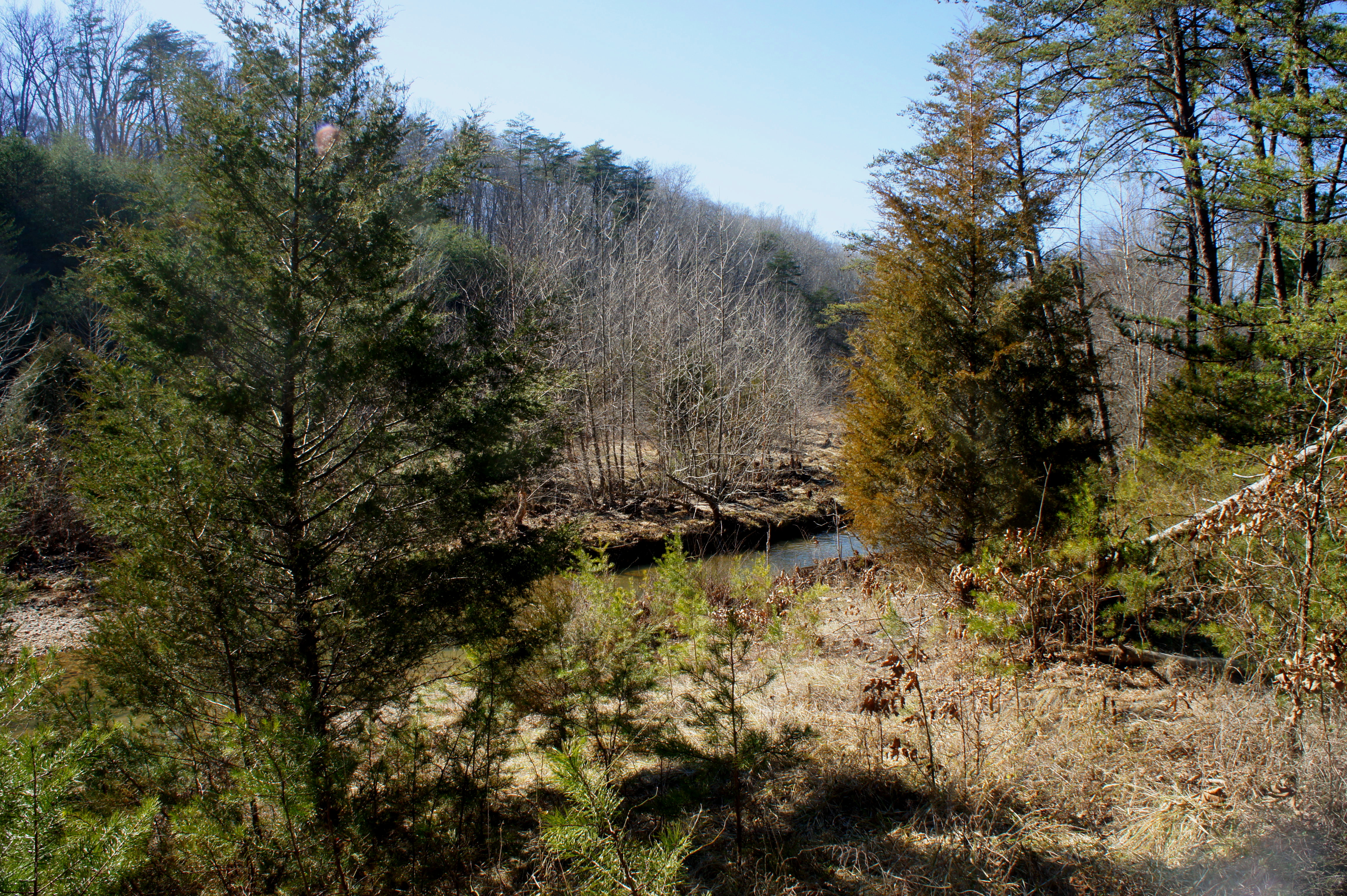 Shortly after, the path narrows and ascends the side of a ridge to a point about 20-30 feet above the creek bed. Within a couple hundred yards, the trail drops back to creek level and passes the remains of an old concrete structure and wooden tower. Just downstream is the confluence of the South Fork and North Fork of Quantico Creek; Pyrite Mine Road enters from the left, and the North Valley Trail begins on the other side of the bridge to the right.
