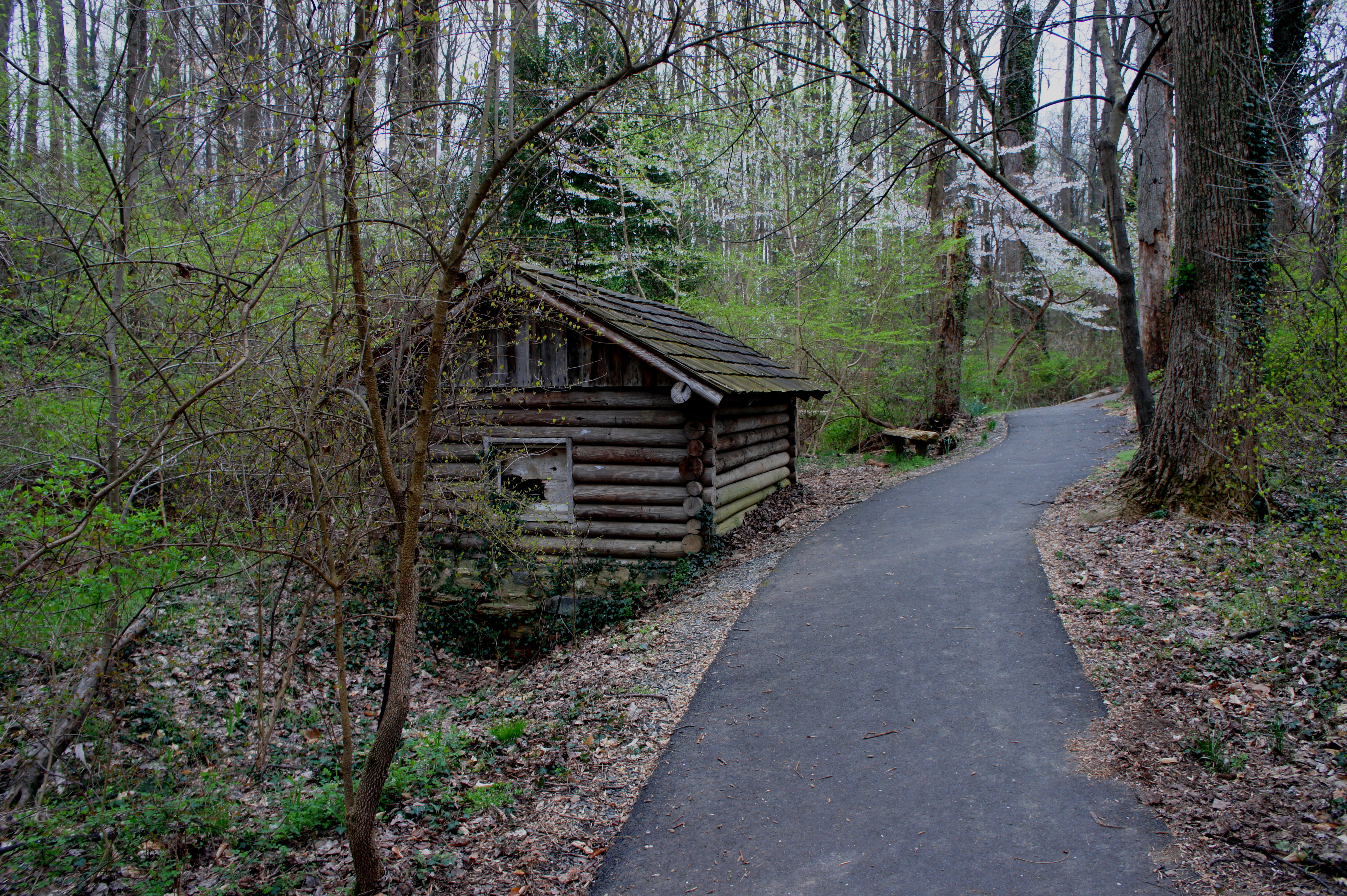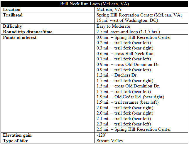 Compared to other hikes in northern Virginia, the following 2.5-mile circuit hike through Bull Neck Run Stream Valley in McLean is a bit of a roller coaster: while mostly paved, the trail rarely stays level. The result is a minor workout and decent scenery as the trail follows a pleasant stream through one of Washington, DC’s ritziest suburbs. While mostly paved, the constant ups-and-downs will pose a challenge for strollers and wheelchairs. The Bull Neck Run Loop starts and ends at the Spring Hill Recreation Center, conveniently located near the intersection of I-495 and the Dulles Access Road.