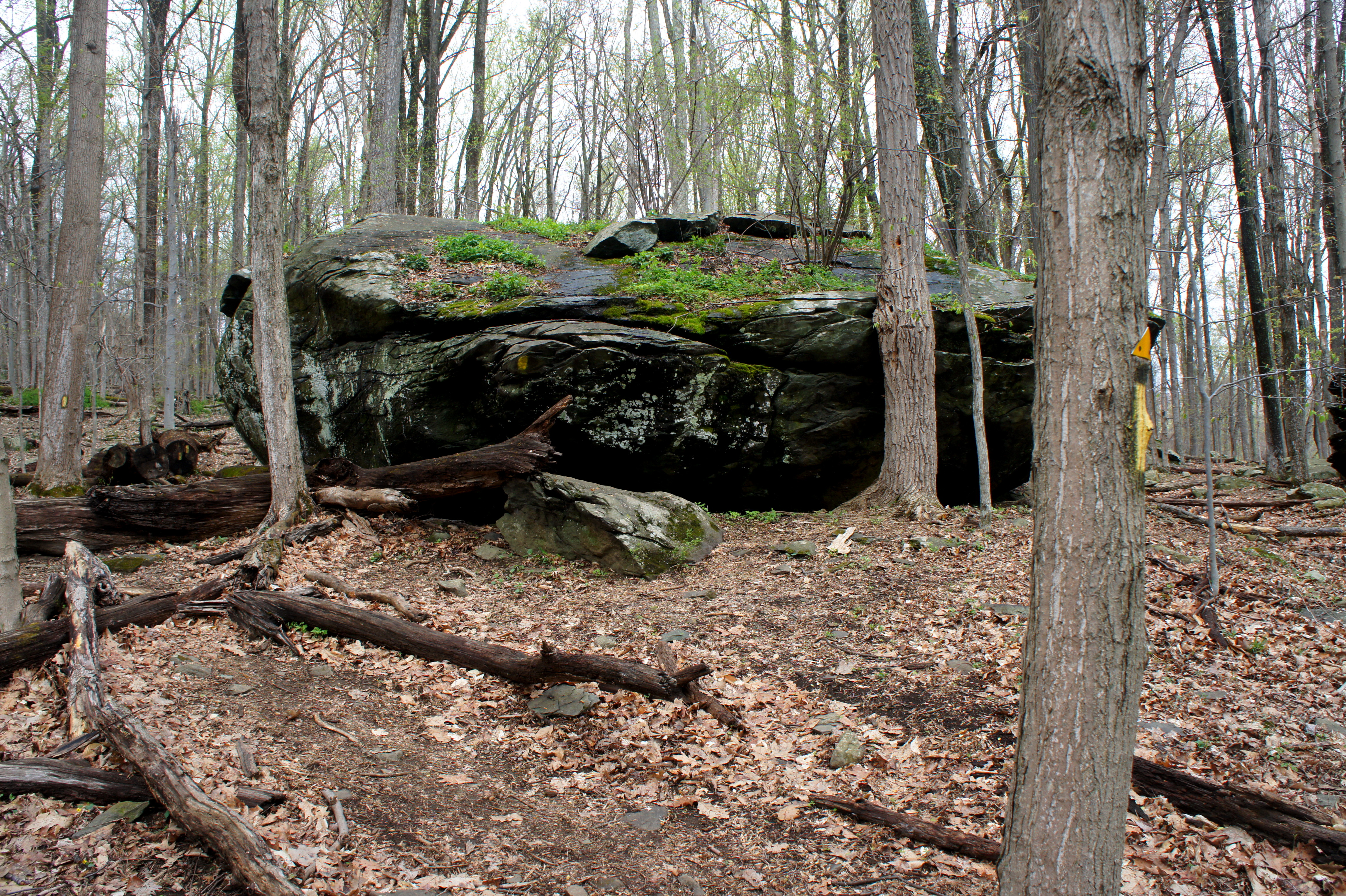 The yellow-blazed path begins by cutting sharply left then ascends a stony ravine strewn with slabs of moss-covered basalt. Around 2/10 mile from the trailhead, the Cliff Trail bears north over rocks and logs and climbs steeply to a brief plateau dominated by a mammoth, ovular chunk of Catoctin greenstone. Round the corner and continue climbing uphill to the first of several trail junctions—stay right. (Note: Heading left provides access to the lengthy Catoctin Trail heading south.)
