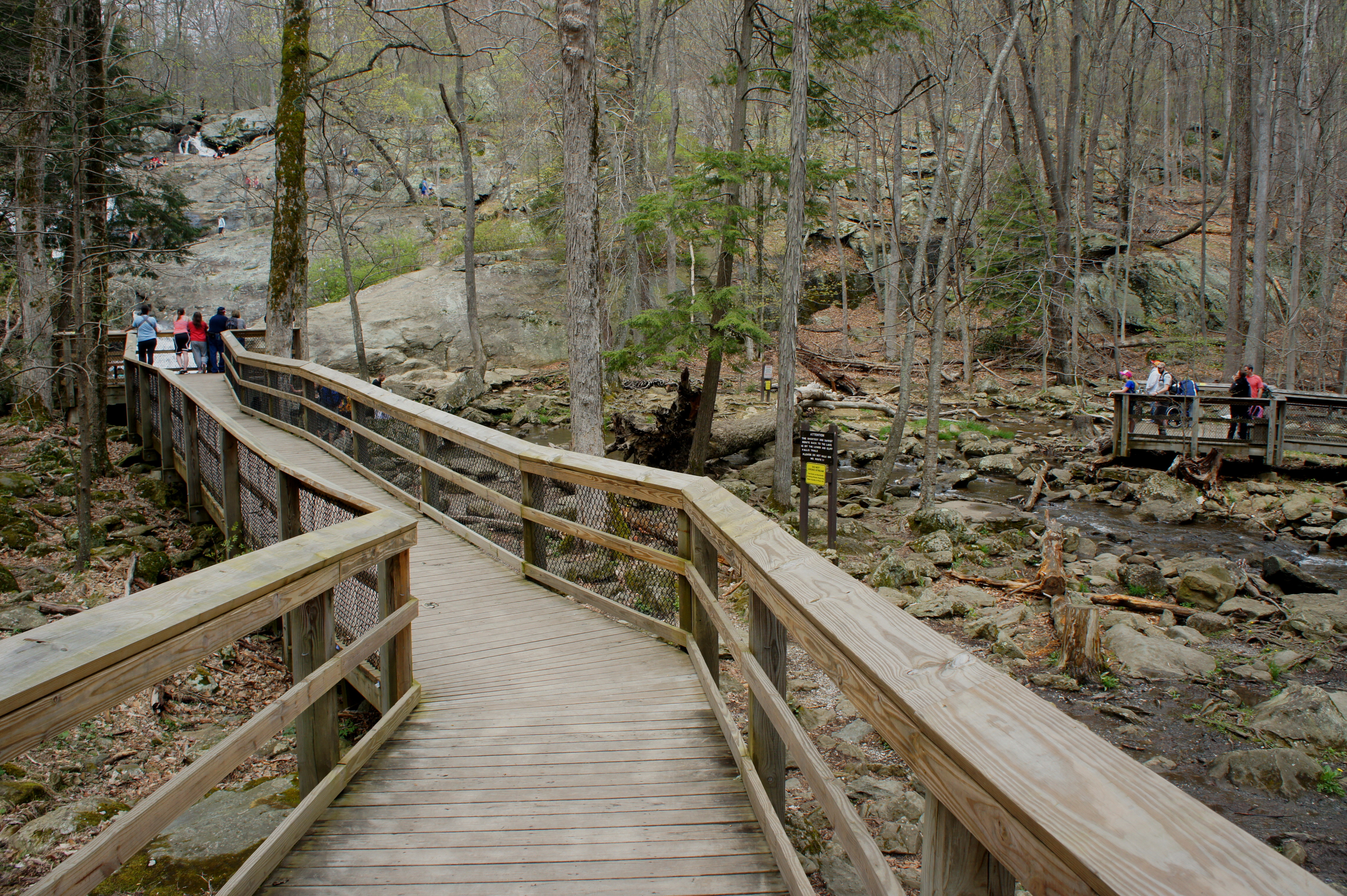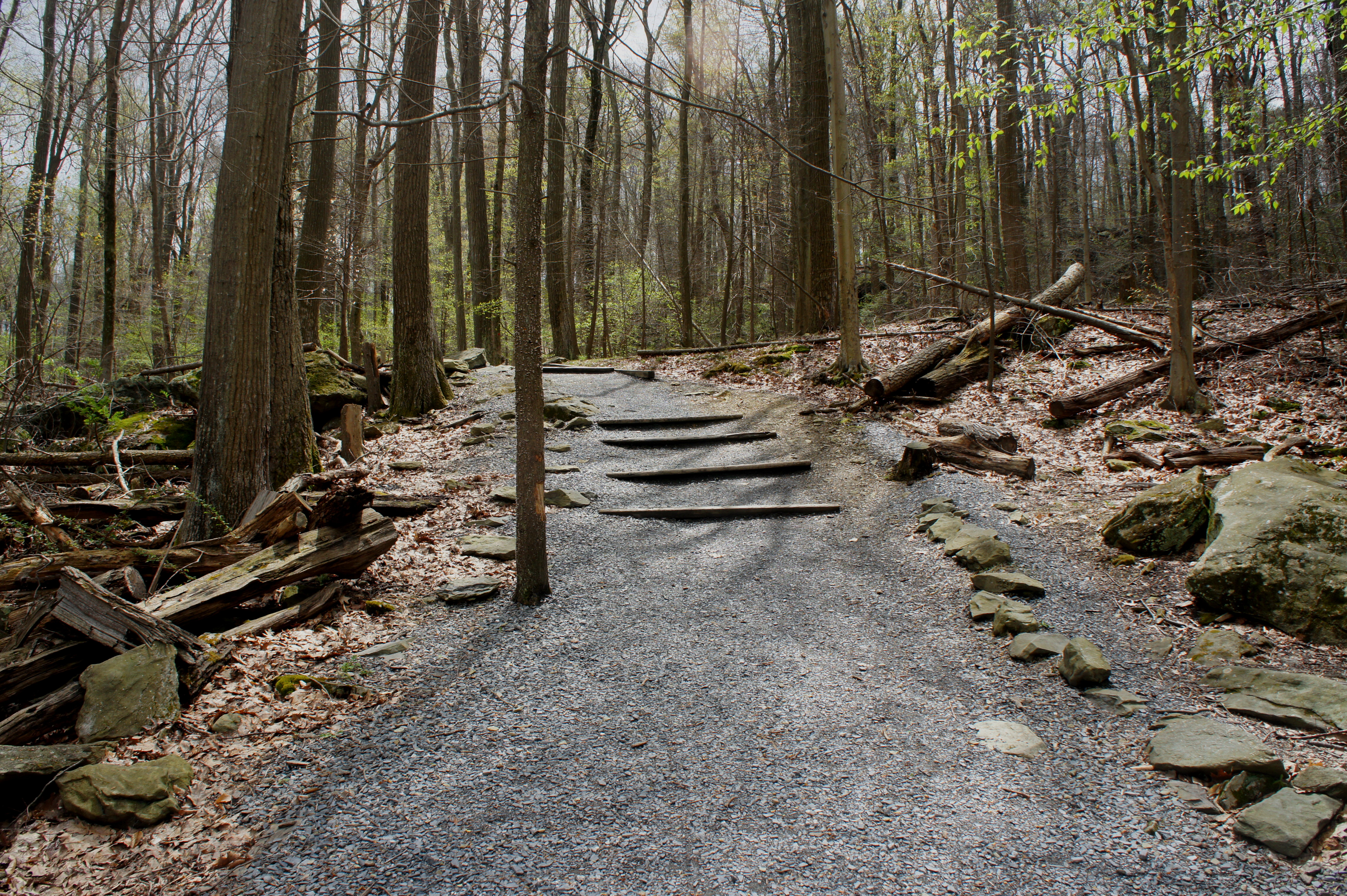 To complete the loop, take the easy Lower Trail (a.k.a. “Falls Trail”) back to the parking area. This crushed gravel path bears southeast as it gains elevation on the tumbling creek below. After 10 minutes of walking, the trail is situated some 60-80 feet higher than the stream, now obscured at the bottom of a woody ravine. As the Lower Trail approaches the parking lot, the terrain gradually levels out and hikers return to the junction with the Cliff Trail. From here it’s less than a minute back to pavement at the trailhead.