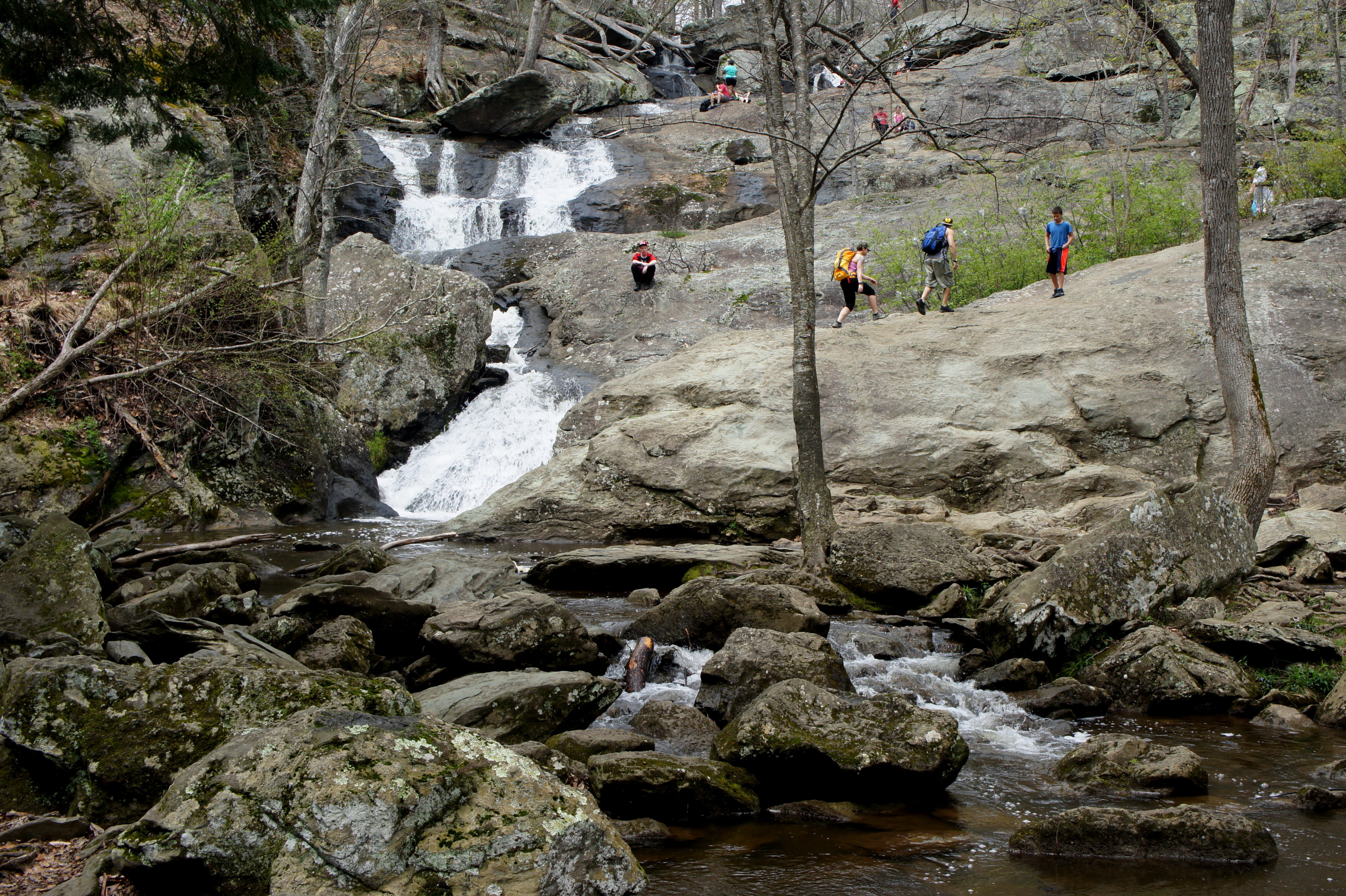 While partly obscured by a huge hemlock, Cunningham Falls appears ahead. Though Maryland’s tallest, the falls does not drop in one free-fall but rather a series of cascades 10-20 feet high, separated by small pools. On a crowded day, it’s a challenge to get a photo without human interference: the falls are crawling with curious visitors fanning out across the curvy greenstone to get a closer look. Another popular viewpoint is visible across the creek, but no official trail connects the two. (Note: this wheelchair-accessible overlook is reachable from the short Boardwalk Trail off Foxville Road.)