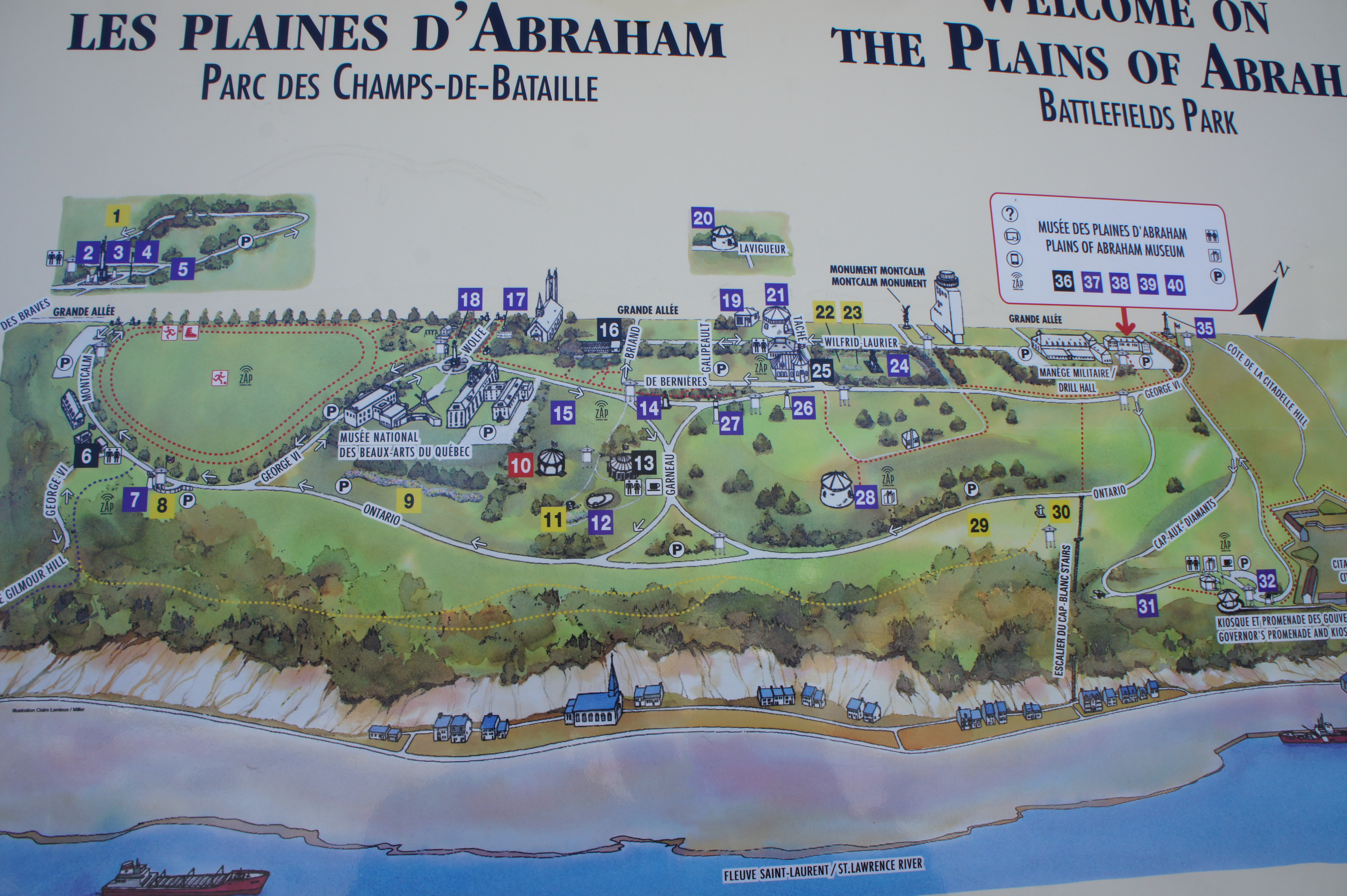 From here Avenue George VI bears southwest. If you have time, check out the Plains of Abraham Museum on the right—which provides a good film and exhibits on the Battle for Quebec during the Seven Years’ War (a.k.a. French and Indian War).