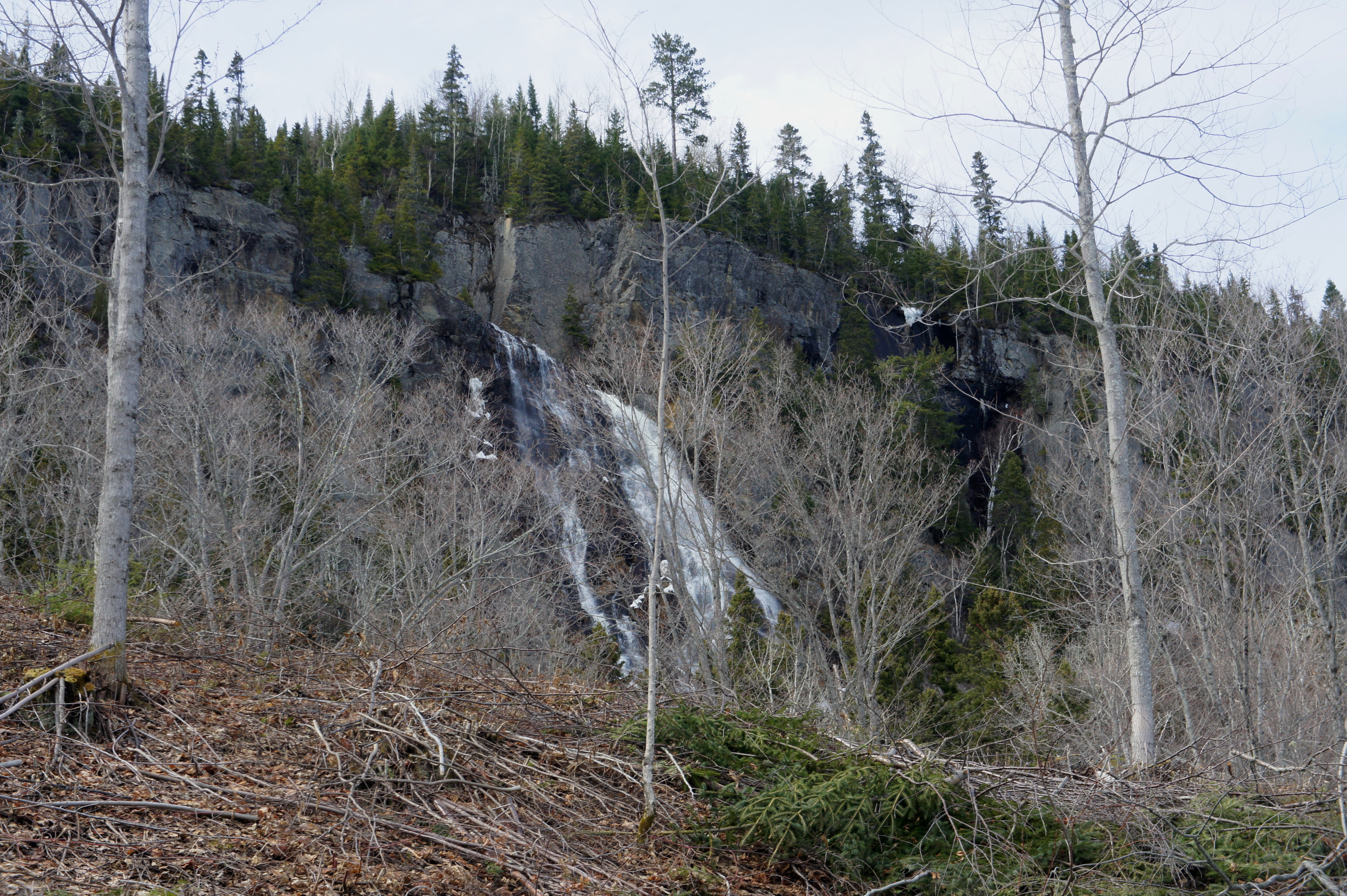 (Note: A disclaimer is in order: while Sentier des Chutes totals 6.9 kilometers (4.3 miles)—ending at the summit of Montagne Blanche—residual snowpack in early May limited our hike to the first mile. Moreover, the snow, more than a foot deep, concealed all obvious paths to the base of Grosse Chute, leaving us slightly disappointed with the nice but obscured views of the falls. Maps and internet beta, however, suggest it is possible to reach a decent view of the falls as the route crosses the associated creek.)