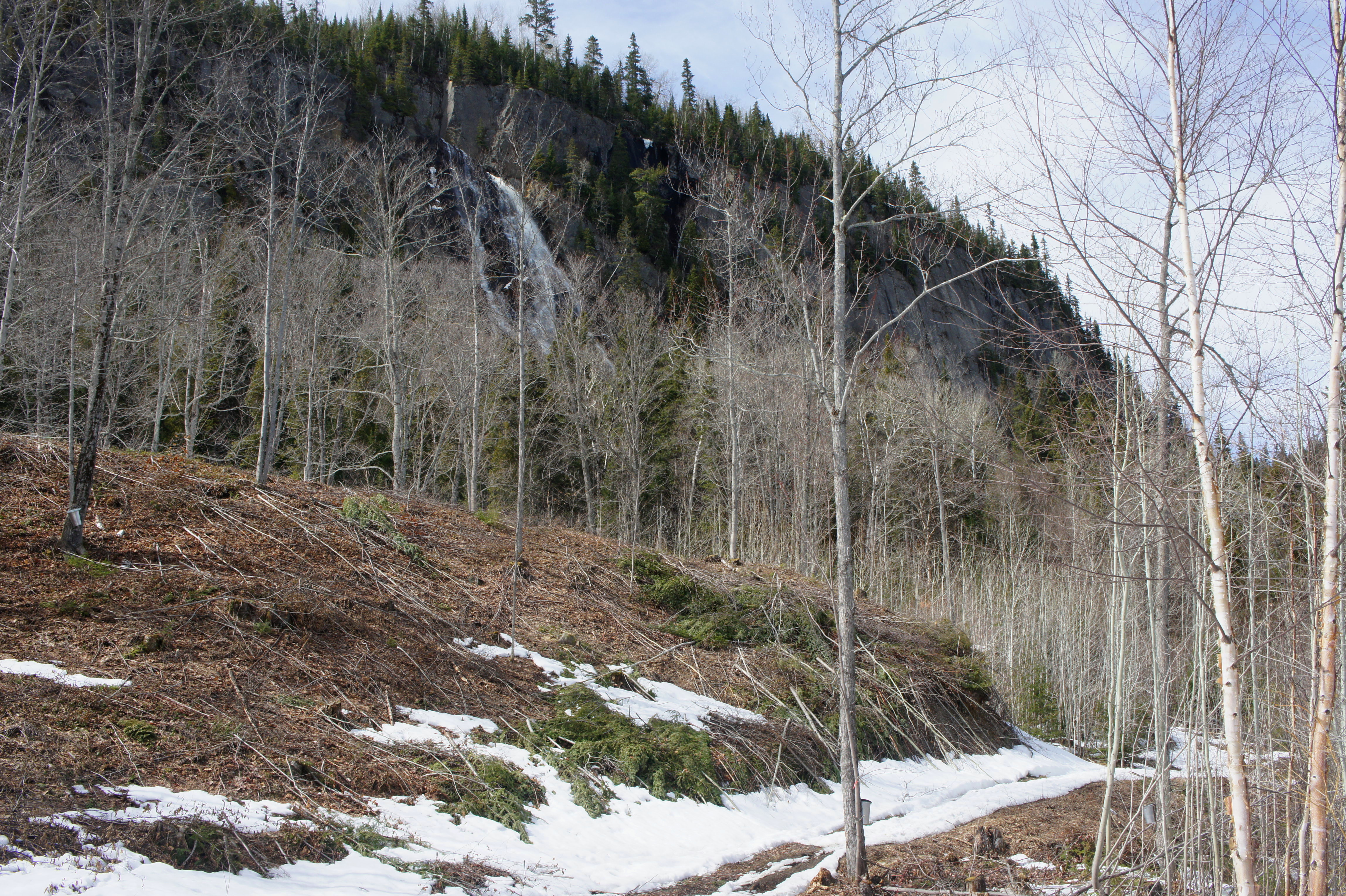 Turn right at the sight of the unexpected outpost at around ¾ miles. Keeping the outpost on the hill on the left, the trail edges northwest toward the falls…and this is where we lost the trail. While the falls are tantalizingly within reach, amid the snow, there was no obvious path through the trees to the base of the falls. And so the hike description ends here, suddenly and disappointedly. (Note: There is, however, a nice view of the Saguenay River and fjords from the outpost.)